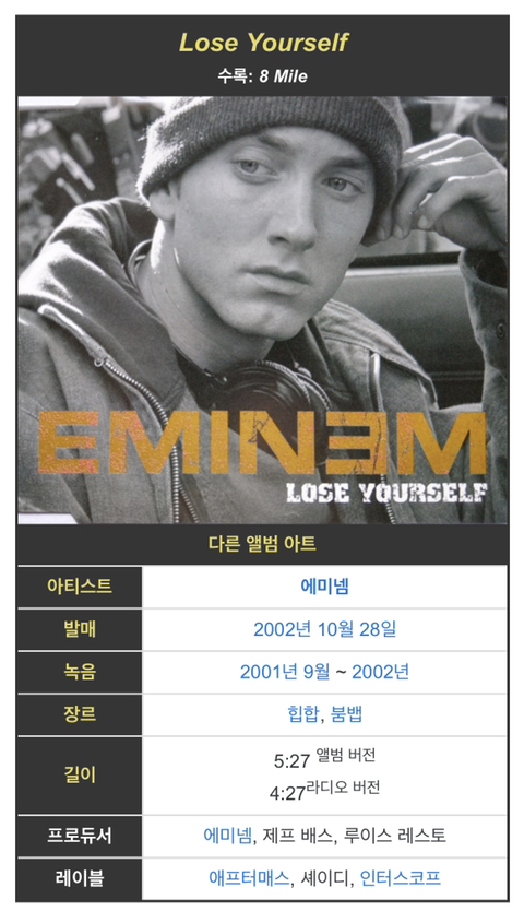 자전적 영화인 8마일 주제가로 무려 아카데미에서 주제가상을 탄 곡