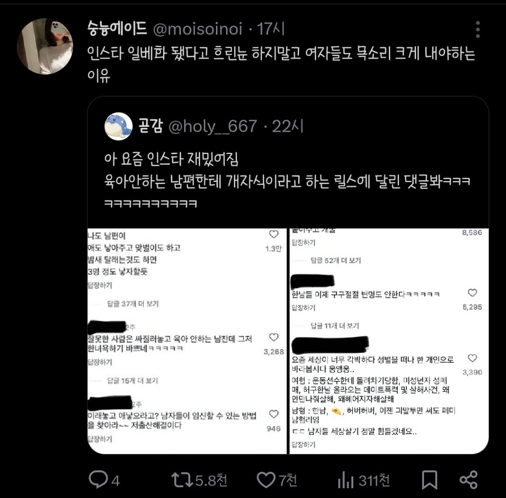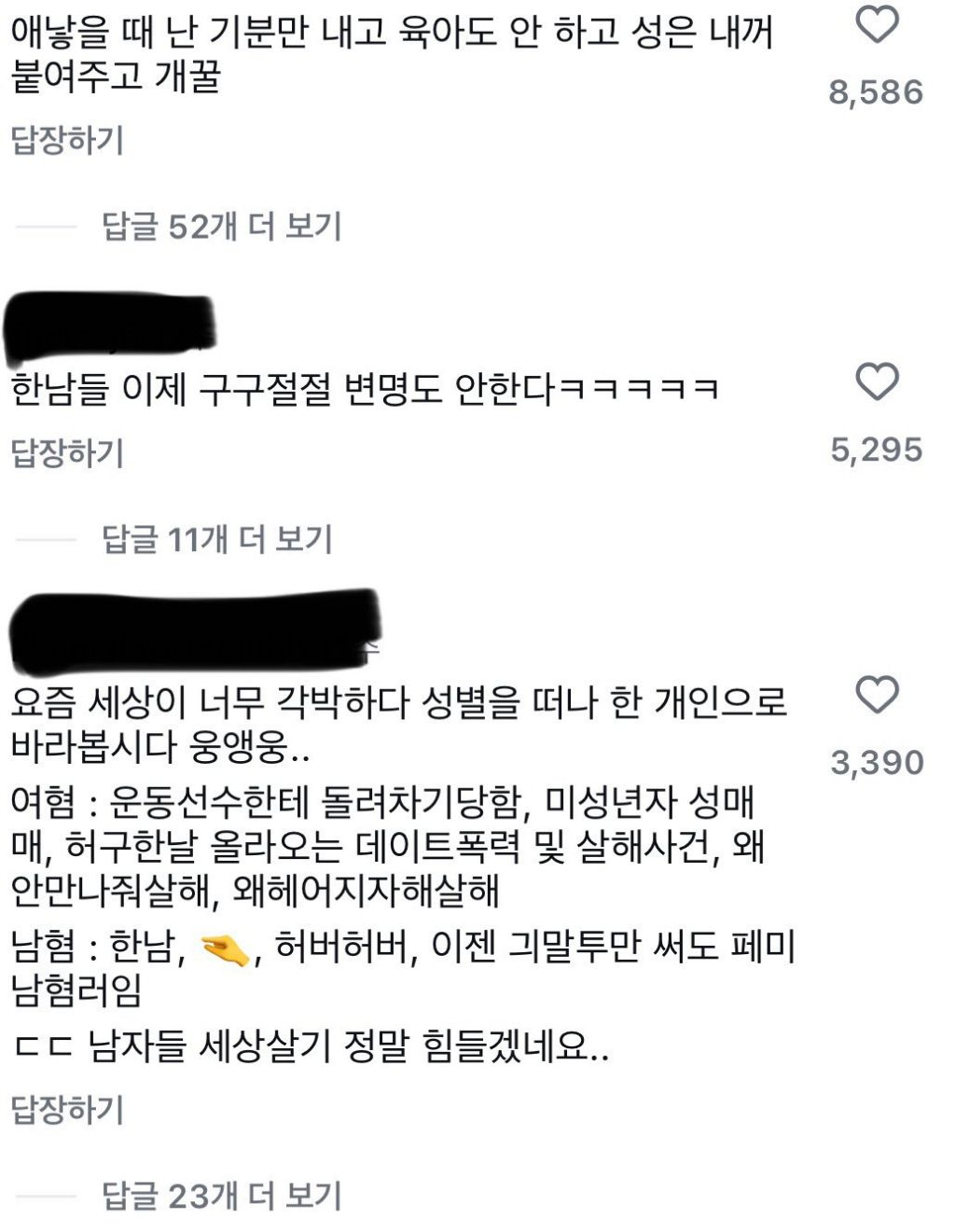 작성자슈크림말차라떼 작성시간 25.03.20 저 릴스 계정에 한남들 성희롱이며 무지성 욕설 댓글도 존나 달아 ㅅㅂ 맞말 써놓으면 우르르 와서 대댓달려서 알람 꺼놓음 많이 와서 한남들이랑 싸워주라