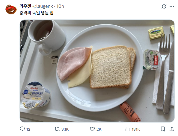 [기타]한국 병원밥은 사실 맛있다 작성자지겹기만한|작성시간25.03.20|조회수79,878 목록 댓글 61 글자크기 작게가 글자크기 크게가 출처: https://x.com/laugenk/status/1902393323605651669 다음검색 현재 게시글 추가 기능 열기 북마크 공유하기 신고 센터로 신고 댓글 댓글 61 댓글쓰기 답글쓰기 댓글 리스트 작성자헤이치 | 작성시간 25.03.20 독일도 약간 음식이 영국스러운가? 작성자햄쪽이 | 작성시간 25.03.21 나도 맛있던데 작성자헴샨드이치 | 작성시간 25.03.21 건강챙겨주는거 맞는지 ㅋ 보니까 미국도 저따위던데..유튭보니까 출산후에도 저런거 나오더라 ㅋㅋㅋ 작성자포워드리 | 작성시간 25.03.27 나도 진짜 맛있었음.. 특식이 존맛.. 이미지 확대 작성자|___| | 작성시간 25.03.30 저러고 저기서 요거트만 빼면 저녁이라고 함.. 진짜임.. 댓글 전체보기