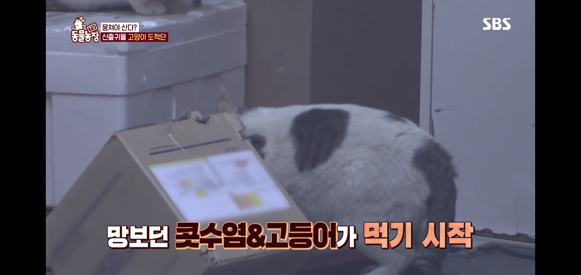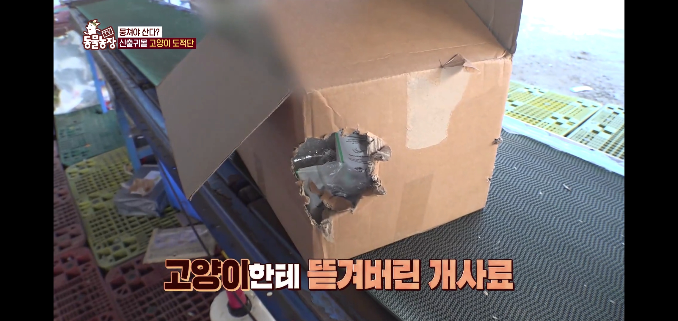 박스는 물론이고 안에 사료 봉지까지 뜯어서 먹은 상황