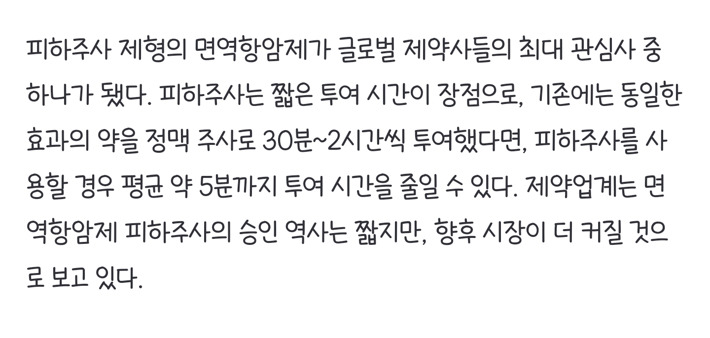 [여시뉴스데스크]‘5분이면 투여 끝’ 면역항암제 피하주사, 제약업계 관심사로 급부상 작성자너너뉘기야|작성시간25.03.20|조회수1,051 목록 댓글 1 글자크기 작게가 글자크기 크게가 출처: https://naver.me/xDJQvBmv‘5분이면 투여 끝’ 면역항암제 피하주사, 제약업계 관심사로 급부상피하주사 제형의 면역항암제가 글로벌 제약사들의 최대 관심사 중 하나가 됐다. 피하주사는 짧은 투여 시간이 장점으로, 기존에는 동일한 효과의 약을 정맥 주사로 30분~2시간씩 투여했다면, 피n.news.naver.com전문 링크 다음검색 현재 게시글 추가 기능 열기 북마크 공유하기 신고 센터로 신고 댓글 댓글 1 댓글쓰기 답글쓰기 댓글 리스트 작성자몬지먼지 | 작성시간 25.03.20 얼른 더 많이 들어왔으면!! 댓글 전체보기