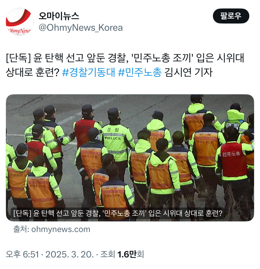 윤석열 대통령 탄핵심판 선고가 임박한 가운데 경찰이 '민주노총' 조끼를 입은 시위대를 상대로 훈련하는 모습이 <오마이뉴스> 카메라에 포착됐다.