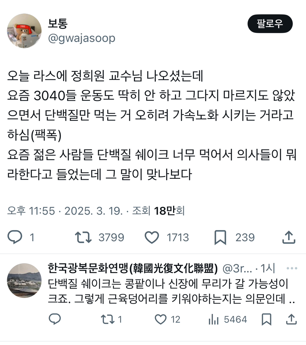[스크랩] [기타]요즘 3040들 운동도 딱히 안 하고 그다지 마르지도 않았으면서 단백질만 먹는 거 오히려 가속노화시키는 거라고 하심.twt