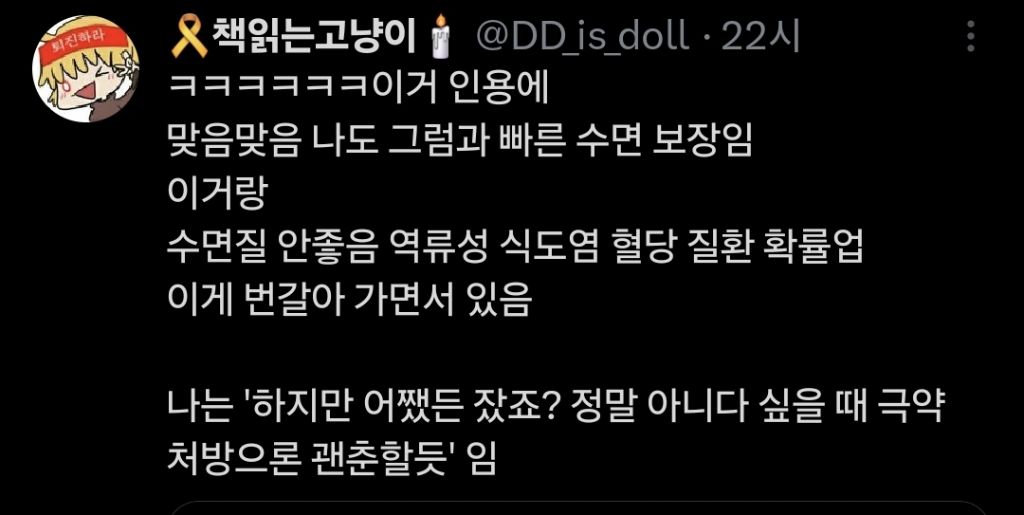 작성자오아리 작성시간 25.03.21 근데 뭘 먹어야 잠이 오는 걸.. ㅎ..