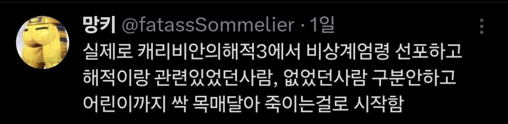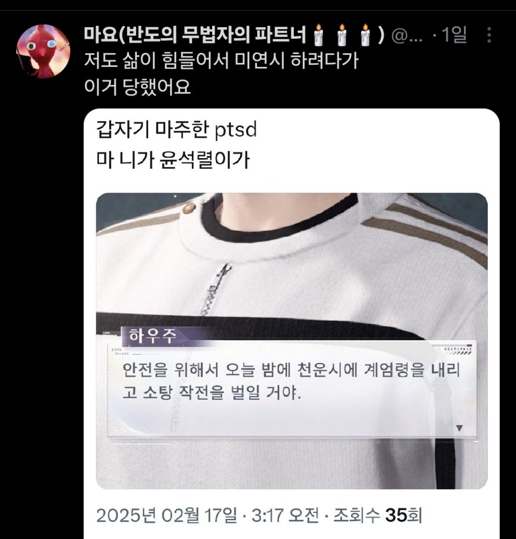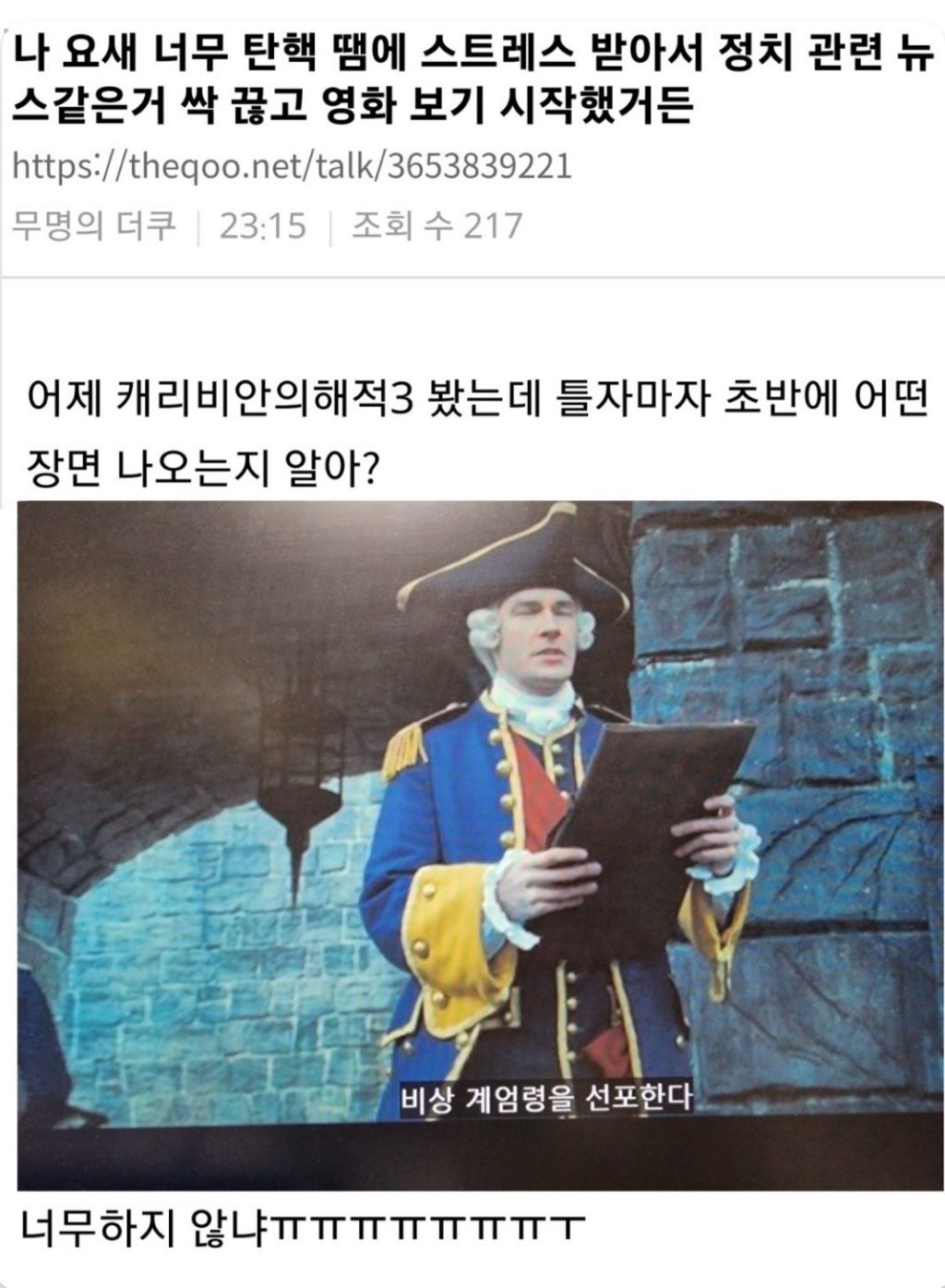 [흥미돋]스트레스 받아서 정치뉴스 끊고 영화보기 시작했거든?ㅠ .twt 작성자유야무이|작성시간25.03.20|조회수10,872 목록 댓글 18 글자크기 작게가 글자크기 크게가 출처: https://x.com/woauemfdjTdj/status/1902166430424179176?t=Y7cWwwIjVk5I0s1HN5tb0g&s=19인용 들어가면 온갖 작품 속 계엄령들 많음 ㅠ 다음검색 현재 게시글 추가 기능 열기 북마크 공유하기 신고 센터로 신고 댓글 댓글 18 댓글쓰기 답글쓰기 댓글 리스트 작성자지옥의 주둥이 | 작성시간 25.03.20 아시발ㅋㅋㅋㄱ너무해 작성자헬리오도르 | 작성시간 25.03.21 씨발 ㅠㅠ 도망도 못가게하네 작성자통통팥팥 | 작성시간 25.03.21 아ㅠㅠ 작성자다롱디리 | 작성시간 25.03.21 스펀지밥 뮤지컬 쿠플에 있길래 틀었는데 거기서도 당함ㅠㅋㅋㅋㅋㅋㅋㅋㅋㅋ 작성자너무어이가업다 | 작성시간 25.03.21 아케인도 보는데 계엄령 나와서 머야ㅜ했어 ㅋㅋㅋ 댓글 전체보기