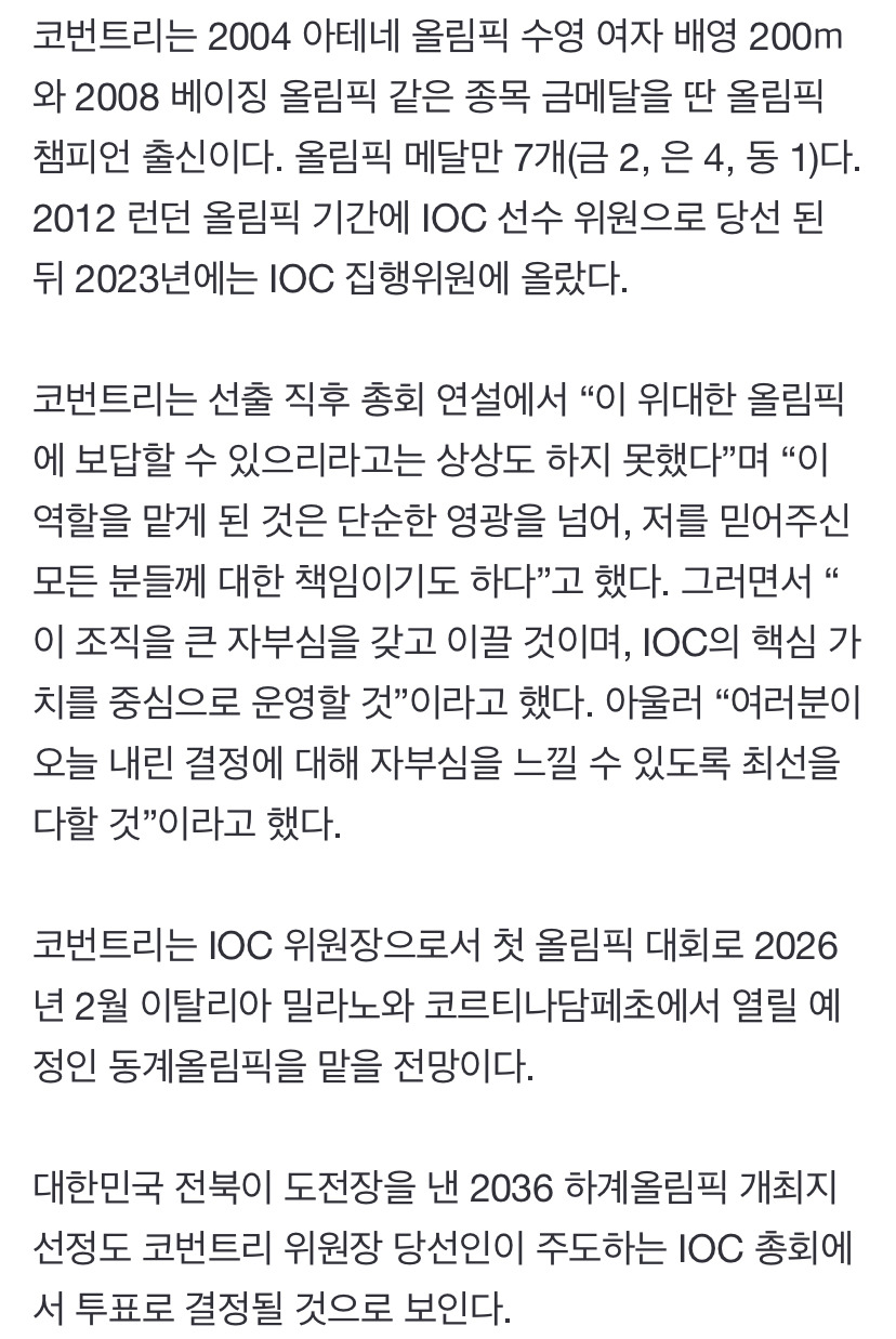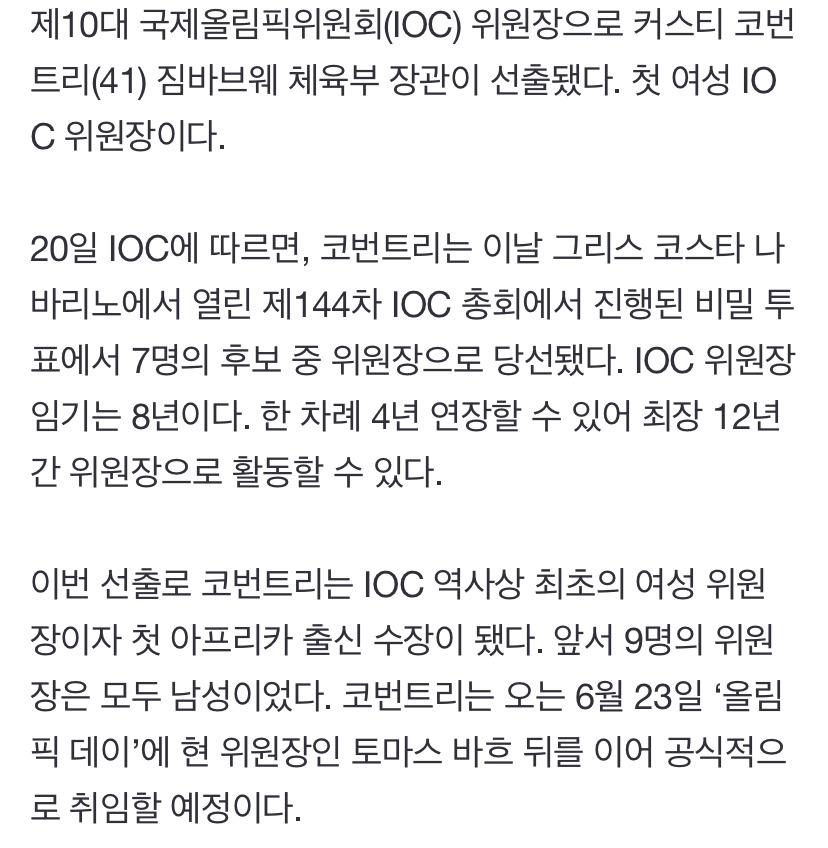 [여시뉴스데스크][속보] 첫 여성 IOC 위원장 탄생…짐바브웨 코번트리 작성자브라우니와 초코쿠키|작성시간25.03.21|조회수5,827 목록 댓글 12 글자크기 작게가 글자크기 크게가 출처: 브라우니와 초코쿠키https://n.news.naver.com/article/023/0003894758?sid=1041983년 9월생이고 전직 짐바브웨 수영선수 출신 다음검색 현재 게시글 추가 기능 열기 북마크 공유하기 신고 센터로 신고 댓글 댓글 12 댓글쓰기 답글쓰기 댓글 리스트 작성자리치영앤부자 | 작성시간 25.03.21 축하드립니다 작성자천운이따르는자 | 작성시간 25.03.21 근데 백인이시네..짐바브웨안에서도 소수인 작성자안다은 | 작성시간 25.03.21 축하드려요! 작성자피넛 블루베리 프라페 | 작성시간 25.03.21 축하드려요🎉🎉🎉 작성자Heritagefloss | 작성시간 25.03.21 축하합니다 댓글 전체보기