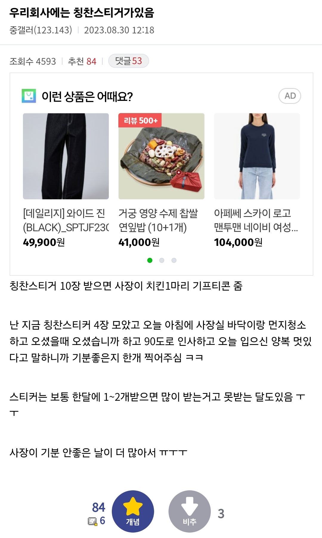 [배꼽의행방]우리회사에는 칭찬스티커가있음 작성자카이지|작성시간25.03.21|조회수60,827 목록 댓글 47 글자크기 작게가 글자크기 크게가 출처: https://m.dcinside.com/board/jungsopd/452140 다음검색 현재 게시글 추가 기능 열기 북마크 공유하기 신고 센터로 신고 댓글 댓글 47 댓글쓰기 답글쓰기 댓글 리스트 작성자보통보통 | 작성시간 25.03.21 난 못할거같은데 남 하는거 보면 웃길듯 ㅋㅋㅋㅋㅋㅋㅋㅋㅋㅋㅋㅋ 작성자포지타노레몬 | 작성시간 25.03.21 개웃겨 ㅋㅋㅋㅋㅋ 작성자숲속을샅샅히 | 작성시간 25.03.21 이순재시상식 작성자니말이맞아 | 작성시간 25.03.22 귀여워 작성자고려 빵즈 | 작성시간 25.03.22 아 걍 졸라웃길듯ㅋㅋㅋㅋ 댓글 전체보기