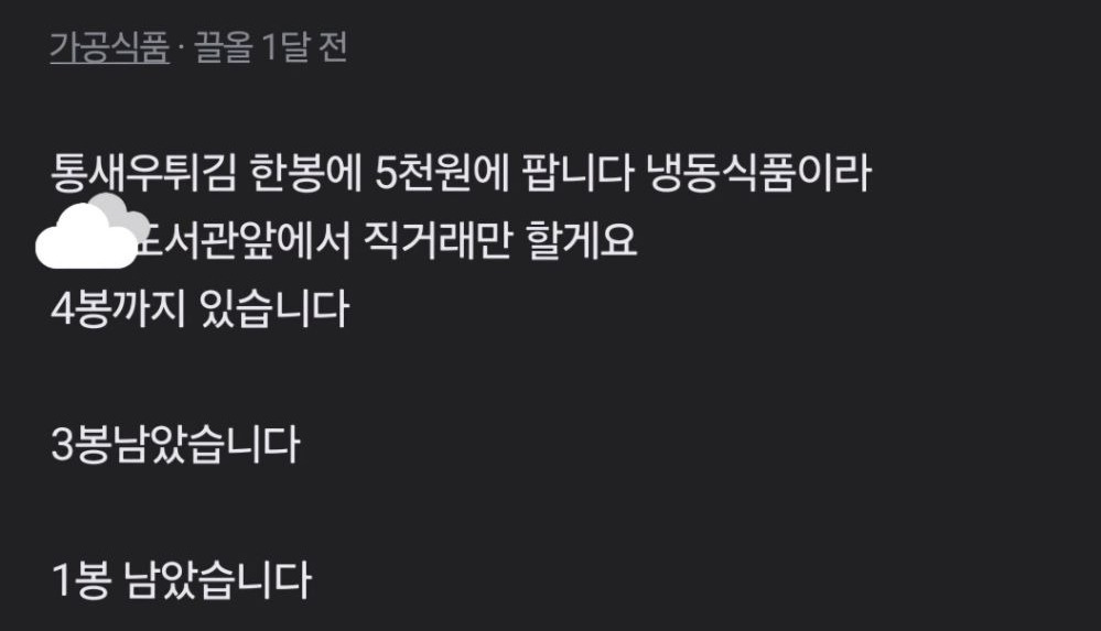 [스크랩] [배꼽의행방]다이어트 하려고 새우튀김 당근에 내놨는데ㅠㅠ 작성자고양이 도적단|작성시간25.03.21|조회수88,640 목록 댓글 51 글자크기 작게가 글자크기 크게가 안팔려서 내가 다 먹고 있음... 다음검색 스크랩 원문 : *여성시대* 차분한 20대들의 알흠다운 공간 현재 게시글 추가 기능 열기 북마크 공유하기 신고 센터로 신고 댓글 댓글 51 댓글쓰기 답글쓰기 댓글 리스트 작성자황희선씨 | 작성시간 25.03.21 아 댓글들도 개웃겨 작성자야당 | 작성시간 25.03.21 동네 사람들한테 새우튀김 먹는거 생중계하냐고 ㅋㅋㅋㅋㅋㅋㅋㅋㅋㅋㅋㅋㅋㅋㅋㅋ 작성자퍼스트펭귄임 | 작성시간 25.03.22 ㅋㅋㅋㅋㅋㅋ아 웃겨 작성자질문은없냐시기에 | 작성시간 25.03.24 ㅋㅋㅋㅋ졸귀 작성자로켓사랑해 | 작성시간 25.03.30 개웃겨 ㅋㅋㅋ 댓글 전체보기