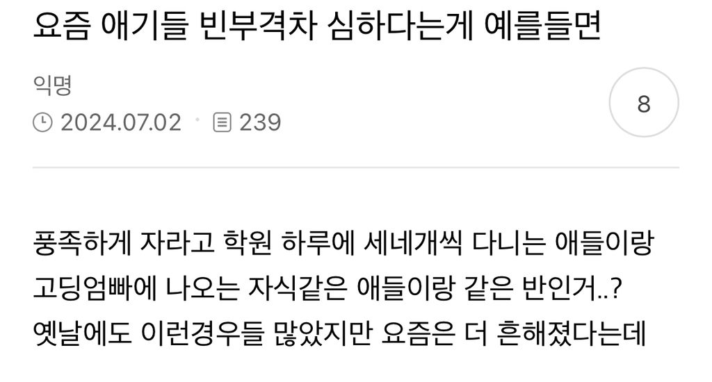 작성자컵 안에 쓰레기 작성시간 25.03.21 난 그래도 초중고 다 같은 오래된 아파트 학군이어서 아주 큰 차이는 못 느꼈는데 대학 가니까 진짜 다르더라 완전 다른 세상이야ㅋㅋ그때 패배감을 참 크게 느꼈는데 어린 아이들은 오죽할까