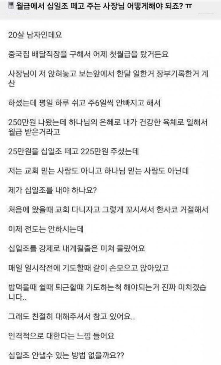 [기타]월급에서 십일조 떼고 주는 사장 작성자민트쵸파|작성시간25.03.21|조회수9,982 목록 댓글 24 글자크기 작게가 글자크기 크게가 출처: 월급에서 십일조 떼고 주는 사장 - 인스티즈(instiz) 이슈 카테고리 다음검색 현재 게시글 추가 기능 열기 북마크 공유하기 신고 센터로 신고 댓글 댓글 24 댓글쓰기 답글쓰기 댓글 리스트 작성자자무카 | 작성시간 25.03.21 감독관님이 좋아하실만한 사건이네 작성자행운이여내게오라 | 작성시간 25.03.21 노동청 신고 ㄱㄱ 작성자내딸김사월 | 작성시간 25.03.21 주 6일에 250인것도 충격이다;; 작성자offscene | 작성시간 25.03.21 노동부 춤추면서 달려옴 작성자북마크용 | 작성시간 25.03.21 ???? 님 도르신? 댓글 전체보기