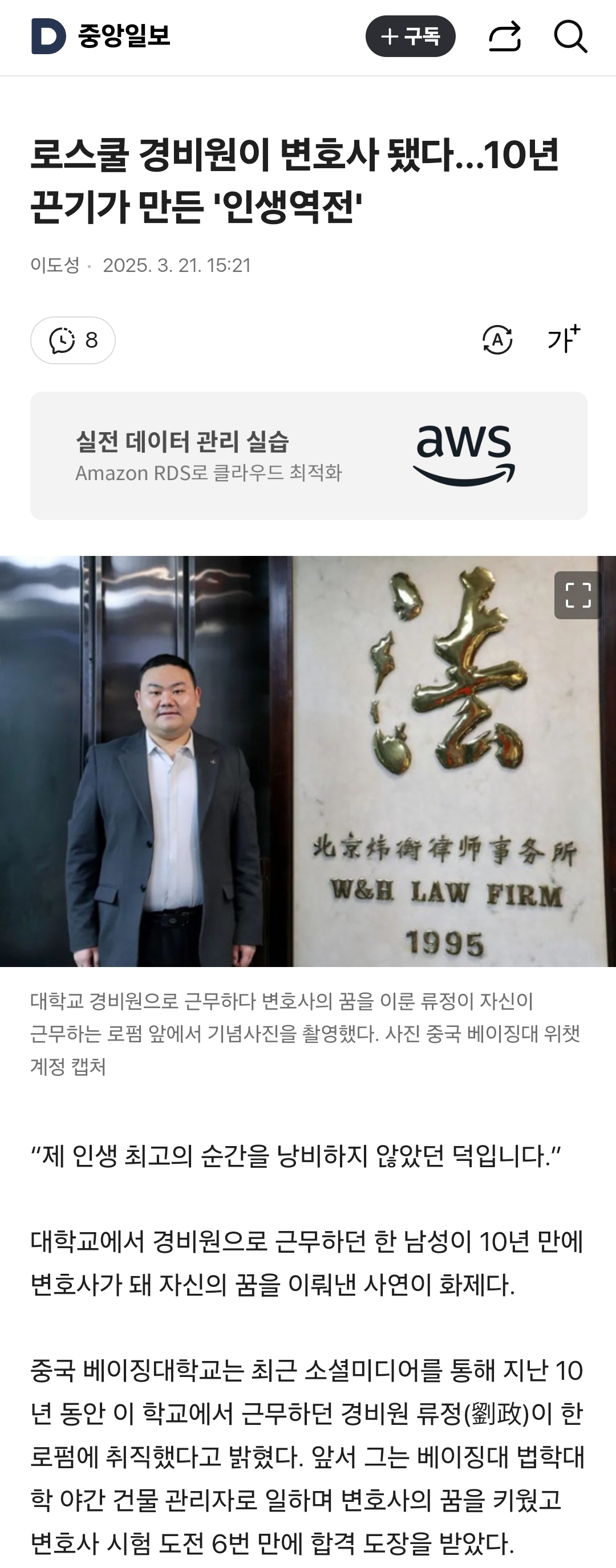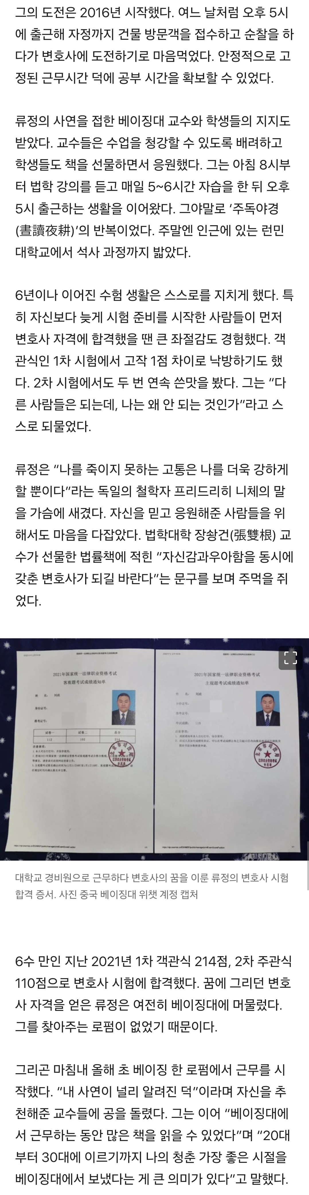[여시뉴스데스크]로스쿨 경비원이 변호사 됐다…10년 끈기가 만든 '인생역전' 작성자댕냥꿈꿈|작성시간25.03.21|조회수16,300 목록 댓글 15 글자크기 작게가 글자크기 크게가 출처: https://v.daum.net/v/20250321152155543 ... 전문은 출처로.. 다음검색 현재 게시글 추가 기능 열기 북마크 공유하기 신고 센터로 신고 댓글 댓글 15 댓글쓰기 답글쓰기 댓글 리스트 작성자라하면파을렬석윤 | 작성시간 25.03.21 진짜멋지다 작성자마론티라미수 | 작성시간 25.03.21 와...대단하다 작성자아괜히했다 | 작성시간 25.03.21 소름 ㅠㅠ 진짜 멋지네 작성자물티슈사기 | 작성시간 25.03.21 멋지다!!! 작성자크르미초콜릿 | 작성시간 25.03.23 주변 사람들의 지지와 응원도 중요하구나ㅠㅠㅠㅠ감동이다 댓글 전체보기