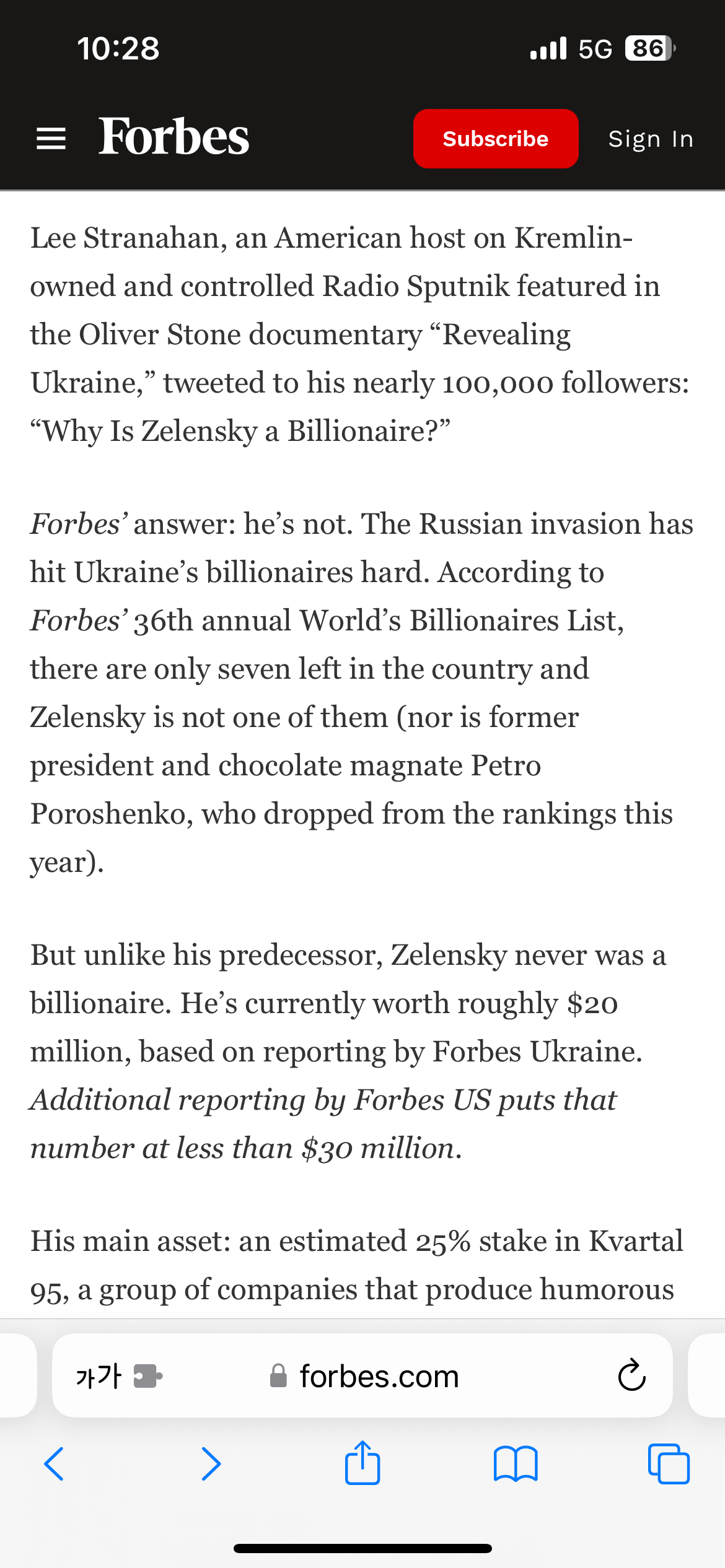 2. 포브스가 젤렌스키가 재산증식 안했다고 말한 근거는 젤렌스키가 발표한 본인명의의 재산 자료(우리나라 선거철마다 하는 정치인 재산공개랑 같은 거)를 근거로 쓴 기사