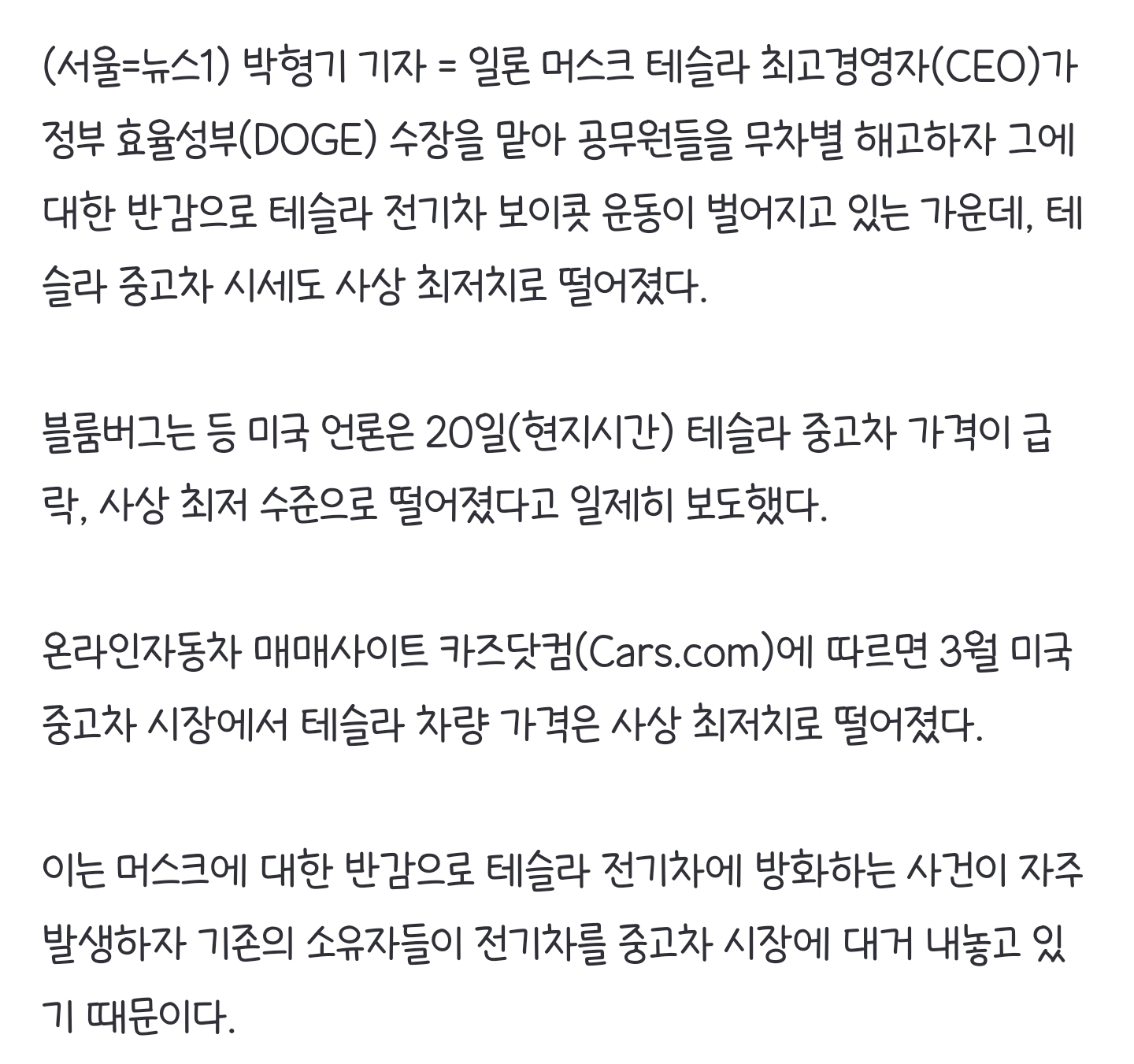 [여시뉴스데스크]"방화 겁나 3000만원 손해보고 팔았다"…테슬라 중고차 값도 급락 작성자너너뉘기야|작성시간25.03.21|조회수5,401 목록 댓글 1 글자크기 작게가 글자크기 크게가 출처: https://naver.me/xoH00KCf"방화 겁나 3000만원 손해보고 팔았다"…테슬라 중고차 값도 급락일론 머스크 테슬라 최고경영자(CEO)가 정부 효율성부(DOGE) 수장을 맡아 공무원들을 무차별 해고하자 그에 대한 반감으로 테슬라 전기차 보이콧 운동이 벌어지고 있는 가운데, 테슬라 중고차 시n.news.naver.com전문 링크 다음검색 현재 게시글 추가 기능 열기 북마크 공유하기 신고 센터로 신고 댓글 댓글 1 댓글쓰기 답글쓰기 댓글 리스트 작성자체리주길레 | 작성시간 25.03.21 요즘 일론 이미지= 나치니까 그럴만도함 ㅋㅋㅋ 댓글 전체보기