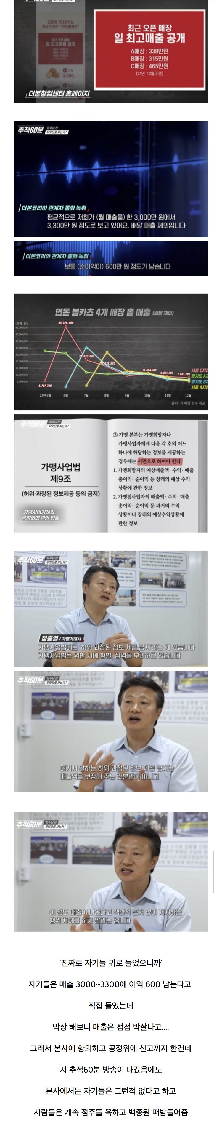 [기타]연돈볼카츠 점주들이 들고 일어난 이유 ㄷㄷ 작성자성악설|작성시간25.03.21|조회수47,499 목록 댓글 18 글자크기 작게가 글자크기 크게가 출처: https://m.fmkorea.com/best/8140532206연돈볼카츠 점주들이 들고 일어난 이유 ㄷㄷ'진짜로 자기들 귀로 들었으니까'자기들은 매출 3000~3300에 이익 600 남는다고 직접 들었는데막상 해보니 매출은 점점 박살나고....그래서 본사에 항의하고 공정위에 신고까지 한건데저 추적60분 m.fmkorea.com 다음검색 현재 게시글 추가 기능 열기 북마크 공유하기 신고 센터로 신고 댓글 댓글 18 댓글쓰기 답글쓰기 댓글 리스트 작성자커피밀크셰이크 | 작성시간 25.03.21 걍 맛이 없던데 ㅠ 근데 볼카츠 지점 개빠르게 많이 생기고 개빠르게 많이 없어짐 작성자감자빵고구마빵옥수수빵 | 작성시간 25.03.21 연돈 사장님이 낸거 아니였어...? 헐.... 작성자새닉입요 | 작성시간 25.03.22 헐 연돈사장님이 하신건줄알았는데 작성자냥르장머리 | 작성시간 25.03.22 내가 돈까 좋아해서 동네 생기자마자 다 먹었는데 노맛이였음 작성자당근당근당근당근당 | 작성시간 25.05.07 헐 미친… 댓글 전체보기
