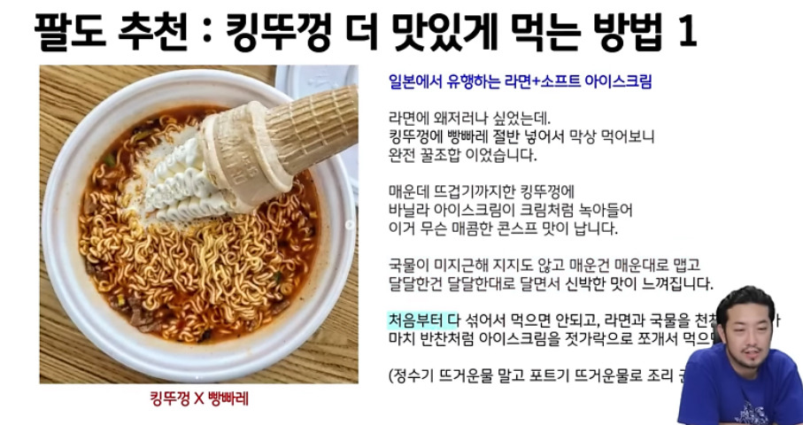 [기타]sns에서 유행중인 킹뚜껑+빵빠레 레시피 작성자루카기어다니노|작성시간25.03.21|조회수28,946 목록 댓글 53 글자크기 작게가 글자크기 크게가 출처: 여성시대 루카기어다니노저렇게 넣고 녹여서 섞어먹는 건데,의외로 맛있다는 반응도 있더라…일본라멘 맛이래; 다음검색 현재 게시글 추가 기능 열기 북마크 공유하기 신고 센터로 신고 댓글 댓글 53 댓글쓰기 답글쓰기 댓글 리스트 작성자종이컵인데 | 작성시간 25.03.22 우유 라면 같은건가 걍 따로 먹을래^^^ 작성자여름오지마 | 작성시간 25.03.22 엄청 단 우유라면 느낌이려나 작성자스브스뉴스 | 작성시간 25.03.22 음쓰 작성자삼월은망치 | 작성시간 25.03.22 설사하겟다,, 작성자건강몬 | 작성시간 25.03.22 해봤는데 별로야매운걸좋아해서 틈새라면으로 해봤는데 너무 달아 댓글 전체보기