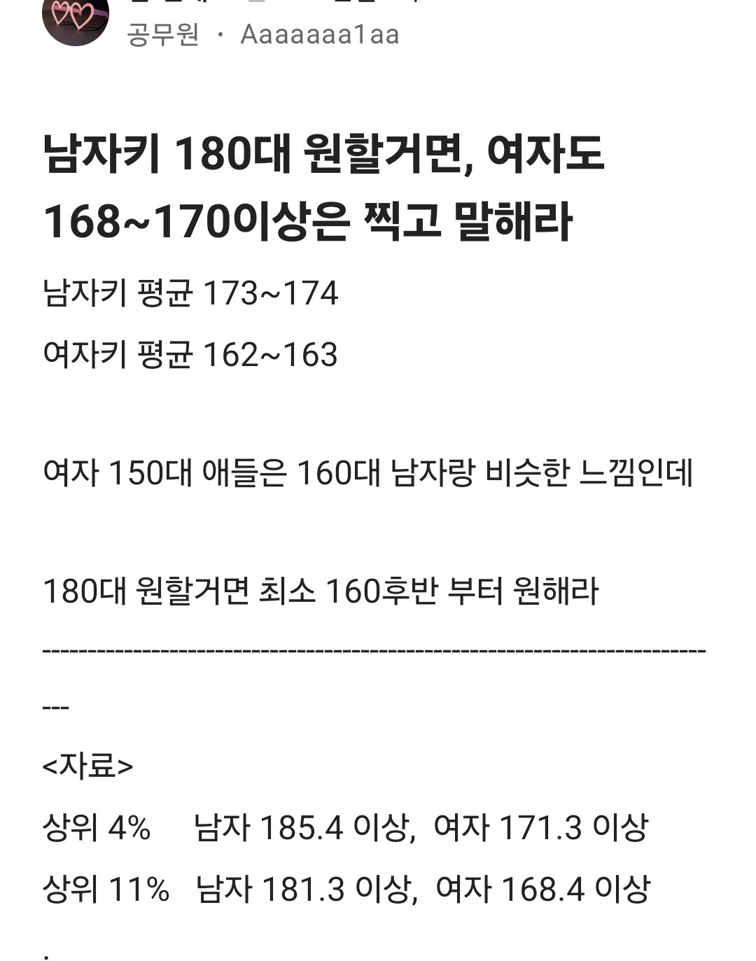 [기타]키(cm) 까지 더치페이 하자는 블라남. blind 작성자나도이직하고시퍼|작성시간25.03.22|조회수39,711 목록 댓글 254 글자크기 작게가 글자크기 크게가 출처: 여성시대 나도이직하고시퍼 다음검색 현재 게시글 추가 기능 열기 북마크 공유하기 신고 센터로 신고 댓글 댓글 254 댓글쓰기 답글쓰기 댓글 리스트 작성자그읅긁 | 작성시간 25.03.24 키작남은 발언권이 없으세요 작성자17:08 | 작성시간 25.03.24 너는.. 그냥 빚을 진거 아니야? 페이할게 없잖아 작성자무식하면 여물어 | 작성시간 25.03.24 이래라 저래라~ 키나 커라~ 작성자씨발이게나라냐 | 작성시간 25.03.24 키작남은 인권이 없으세요~ 작성자금쪽이타로 | 작성시간 25.03.25 역시 🤏 댓글 전체보기