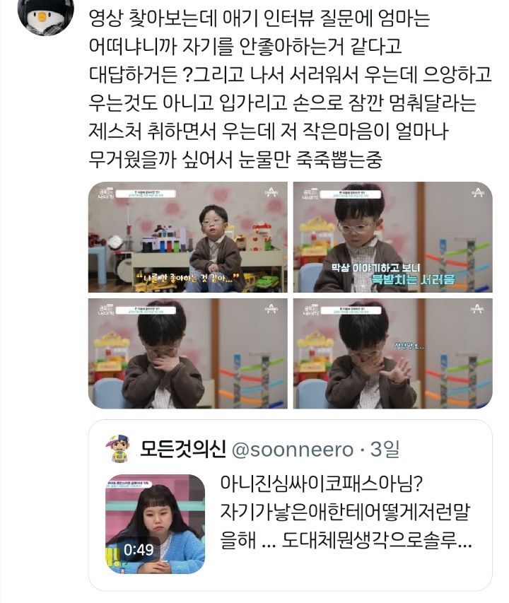 [스크랩] [기타]여시들 눈물 죽죽 뽑은 금쪽이 작성자비자나무 한도|작성시간25.03.22|조회수12,561 목록 댓글 10 글자크기 작게가 글자크기 크게가 출처 : https://twitter.com/soonneero/status/1723737335857316335?t=-izm0EwG6HR99PD_rn3W6w&s=19애가 듣는 말 다음검색 스크랩 원문 : *여성시대* 차분한 20대들의 알흠다운 공간 현재 게시글 추가 기능 열기 북마크 공유하기 신고 센터로 신고 댓글 댓글 10 댓글쓰기 답글쓰기 댓글 리스트 작성자망포동포동 | 작성시간 25.03.22 아오 저 째깐이한테ㅜㅜ 작성자Amoroso | 작성시간 25.03.22 아가… 맘아파 정말 ㅠ 작성자바닐라 라떼 | 작성시간 25.03.22 저 작은 애기한데 ㅠ .... 작성자먹어도안찌는환상 | 작성시간 25.03.22 아 요즘 잘지내는지 너무 걱정돼.. 작성자푸방옹 | 작성시간 25.03.22 에고 입양보내라 차라리 … 사랑충만히 받을 나이다 진짜 ㅅㅂ 댓글 전체보기