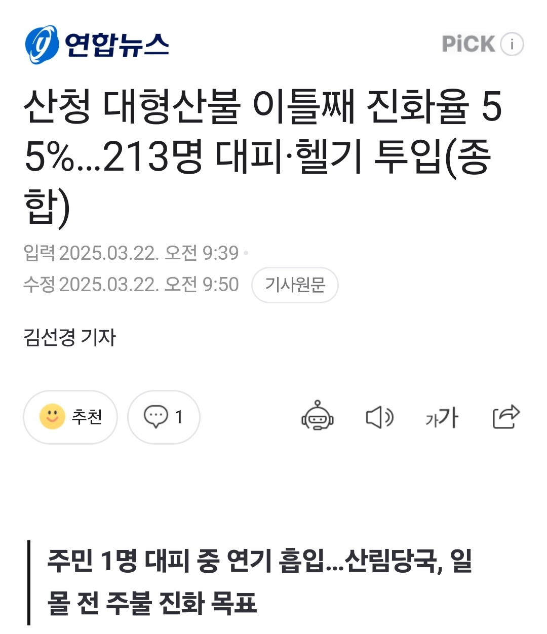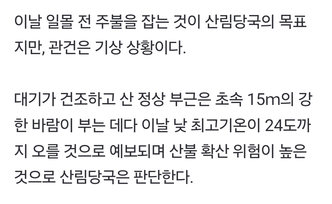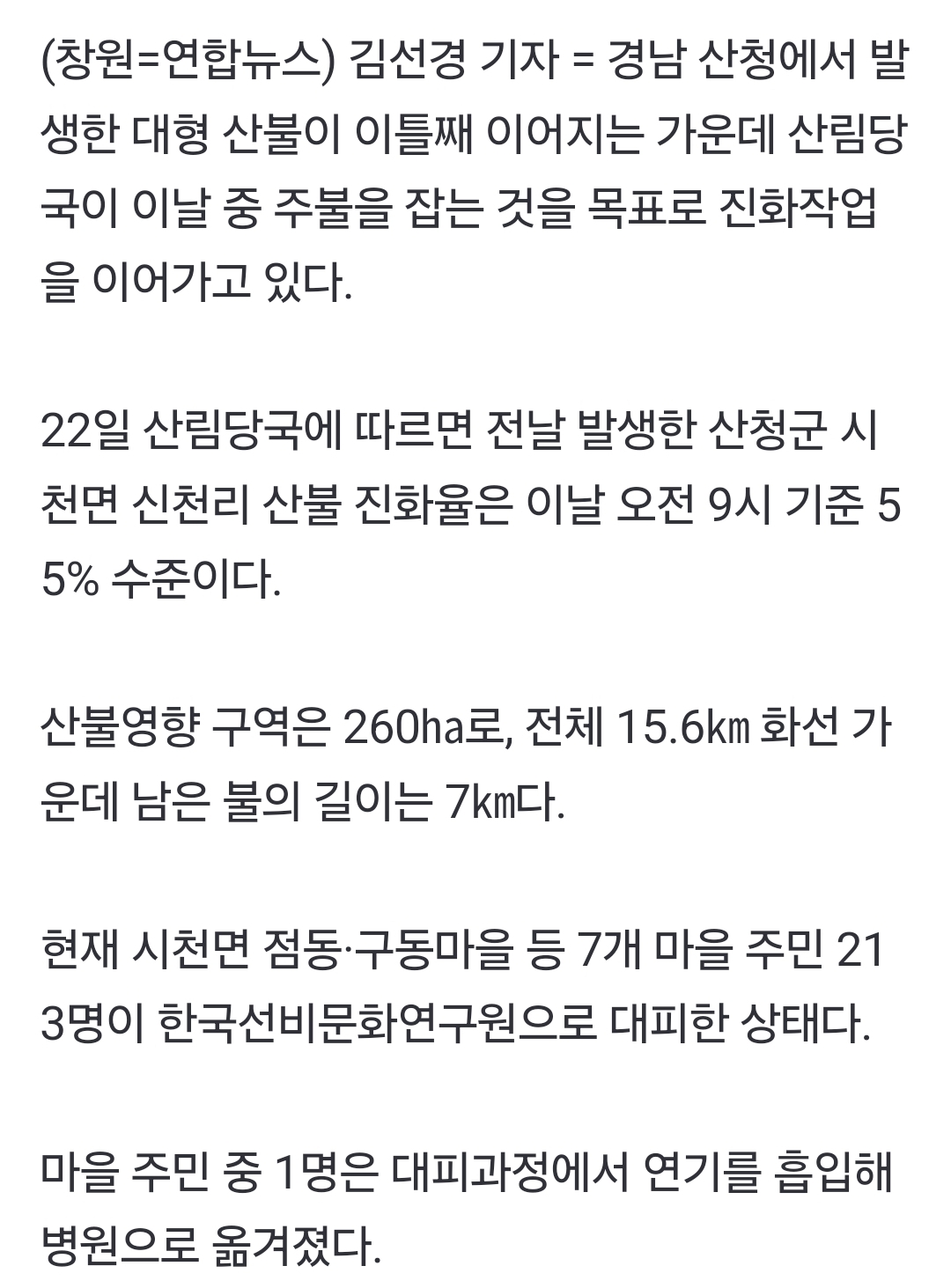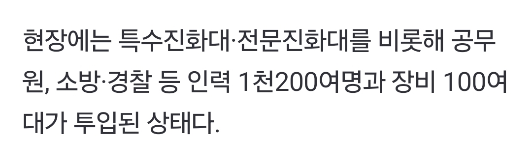 [여시뉴스데스크]산청 대형산불 이틀째 진화율 55%…213명 대피·헬기 투입 작성자인팁잡채|작성시간25.03.22|조회수6,268 목록 댓글 3 글자크기 작게가 글자크기 크게가 출처: https://naver.me/F9NK5bpM산청 대형산불 이틀째 진화율 55%…213명 대피·헬기 투입(종합)주민 1명 대피 중 연기 흡입…산림당국, 일몰 전 주불 진화 목표 경남 산청에서 발생한 대형 산불이 이틀째 이어지는 가운데 산림당국이 이날 중 주불을 잡는 것을 목표로 진화작업을 이어가고 n.news.naver.com전문 출처 참조빨리 잡혀야할건데ㅜㅜㅜ 다음검색 현재 게시글 추가 기능 열기 북마크 공유하기 신고 센터로 신고 댓글 댓글 3 댓글쓰기 답글쓰기 댓글 리스트 작성자WhiteNight | 작성시간 25.03.22 엄청 크던데 얼른 진압되면 좋겟구만 ㅠㅠㅠ 작성자나랑드사이다제로 | 작성시간 25.03.22 아우 어떡해 ㅠㅠㅠ 작성자잇프제그잡채 | 작성시간 25.03.22 ㅠㅠㅠㅠㅠㅠㅠ 댓글 전체보기