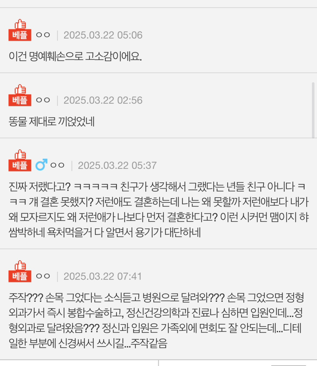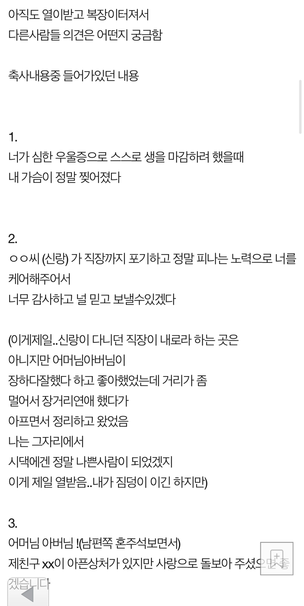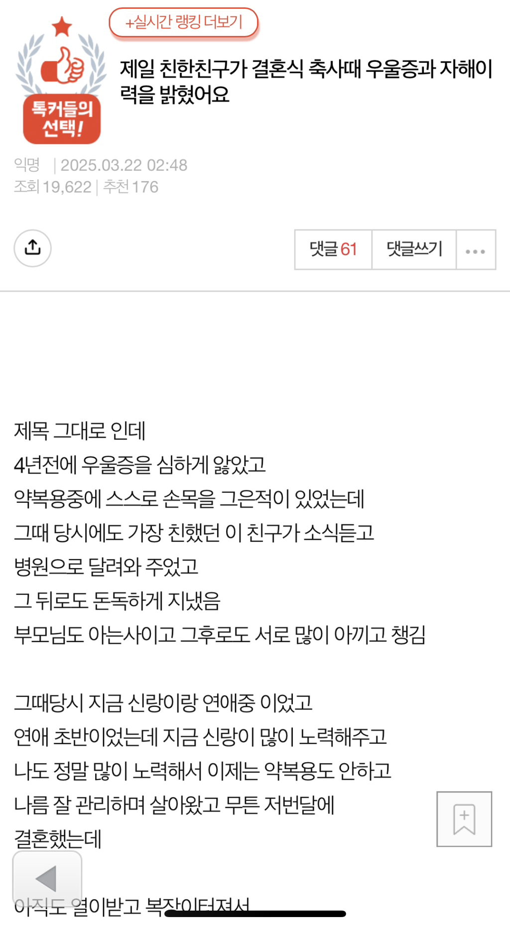 [기타]<네이트판> 제일 친한친구가 결혼식 축사때 우울증과 자해이력을 밝혔어요 작성자SSVvvlllvvllvvvv1|작성시간25.03.22|조회수52,316 목록 댓글 295 글자크기 작게가 글자크기 크게가 출처: https://m.pann.nate.com/talk/374150466?currMenu=talker제일 친한친구가 결혼식 축사때 우울증과 자해이력을 밝혔어요 | 네이트 판결혼/시집/친정 : 제목 그대로 인데 4년전에 우울증을 심하게 앓았고 약복용중에 스스로 손목을 그은적이 있었는데 그때 당시에도 가장 친했던 이 친구가 소식듣고 병원으로 달려와 주었고 그 pann.nate.com 다음검색 현재 게시글 추가 기능 열기 북마크 공유하기 신고 센터로 신고 댓글 댓글 295 댓글쓰기 답글쓰기 댓글 리스트 작성자스우파그여자못잊어모니카 | 작성시간 25.03.23 난 축사에서 신부 전남친 줄줄 읊는것도 봄 ㅋㅋㅋㅋㅋㅋㅋㅋ 작성자뿡빵뿡커리 | 작성시간 25.03.23 친구맞아? 작성자전국길고양이노동조합 | 작성시간 25.03.23 아... ... 작성자익스펠리아무스 | 작성시간 25.03.23 주작. 띄어쓰기 무슨 일이야 작성자내는내다앙앙 | 작성시간 25.03.24 미친거아냐 어떡해 댓글 전체보기