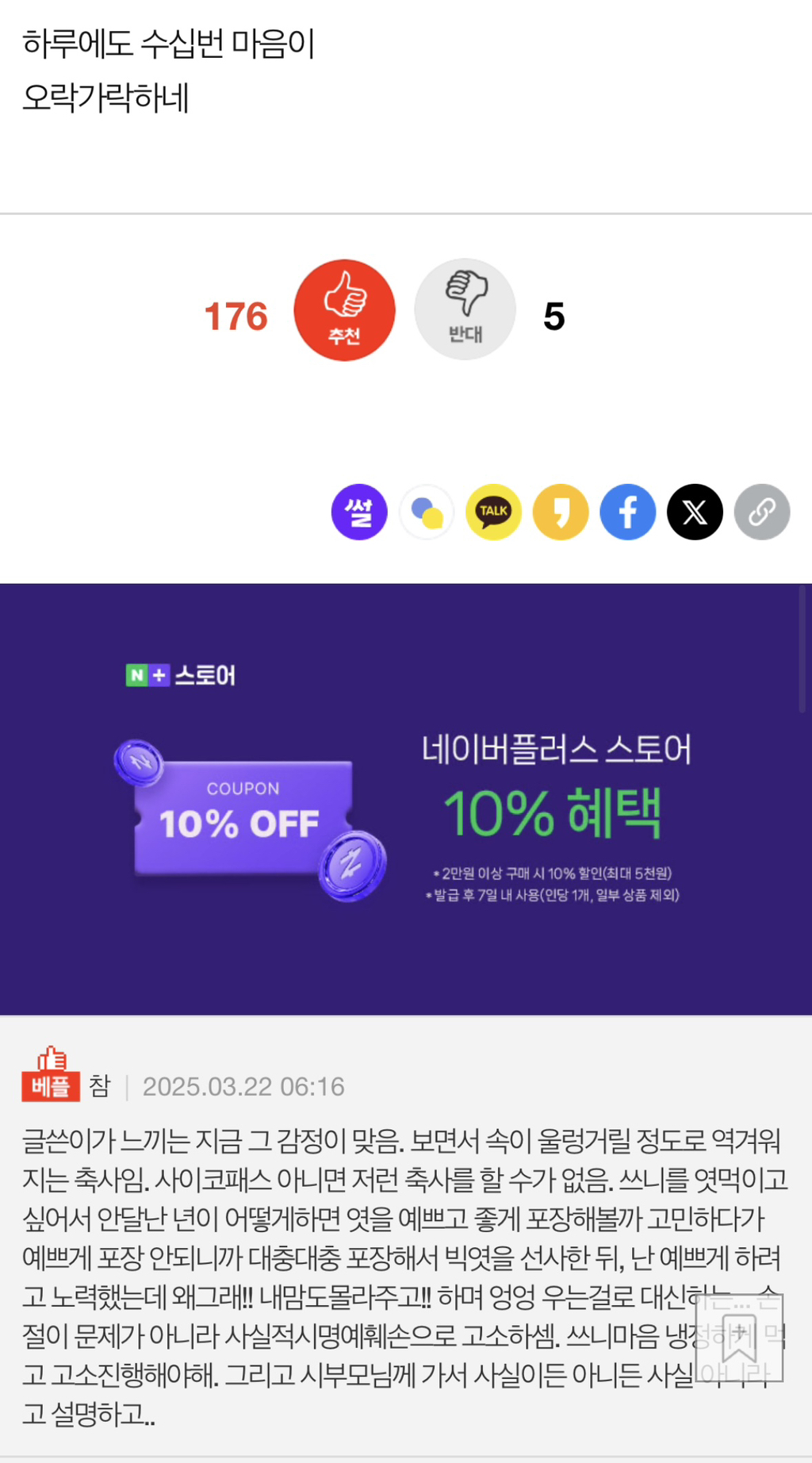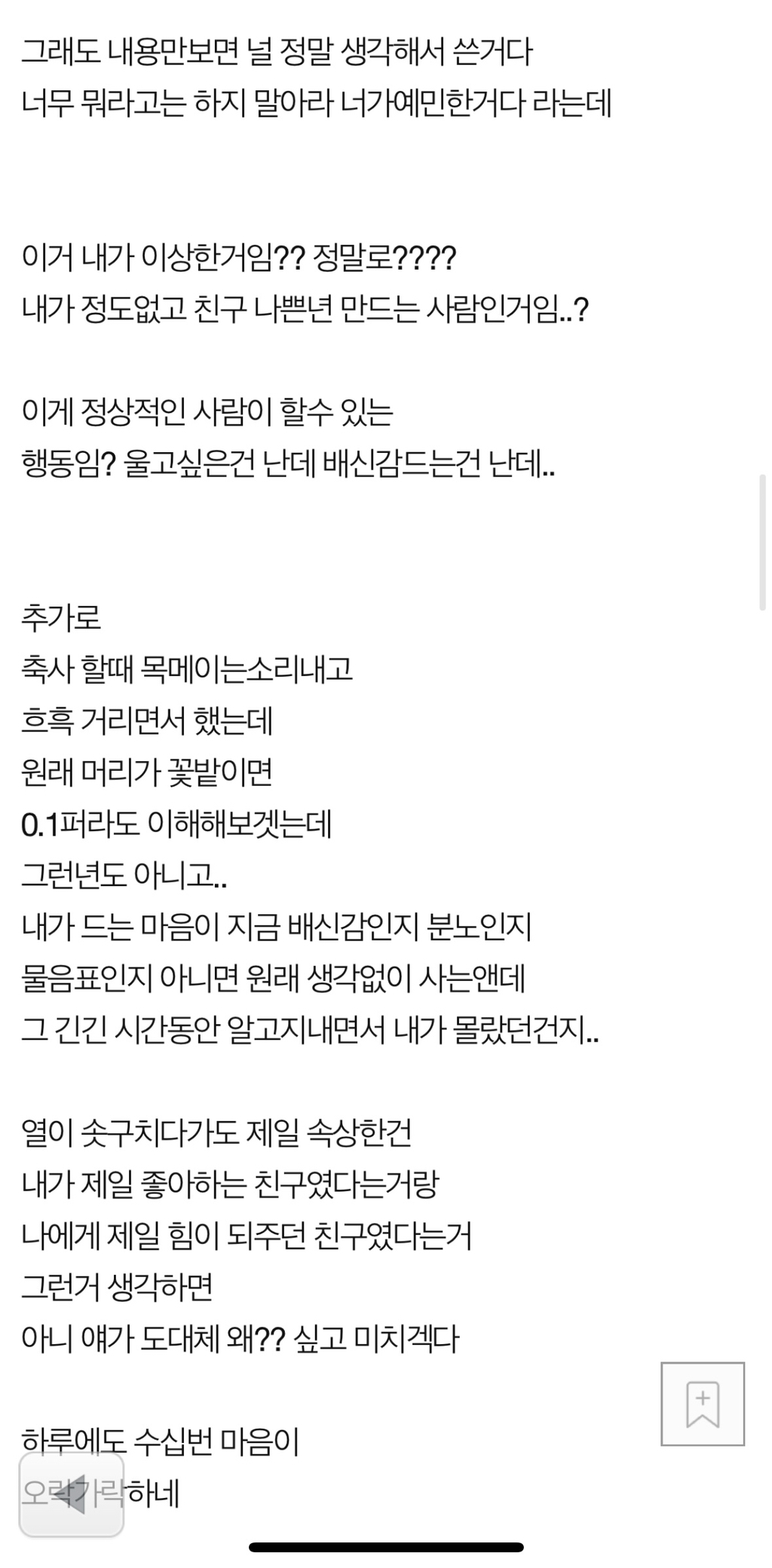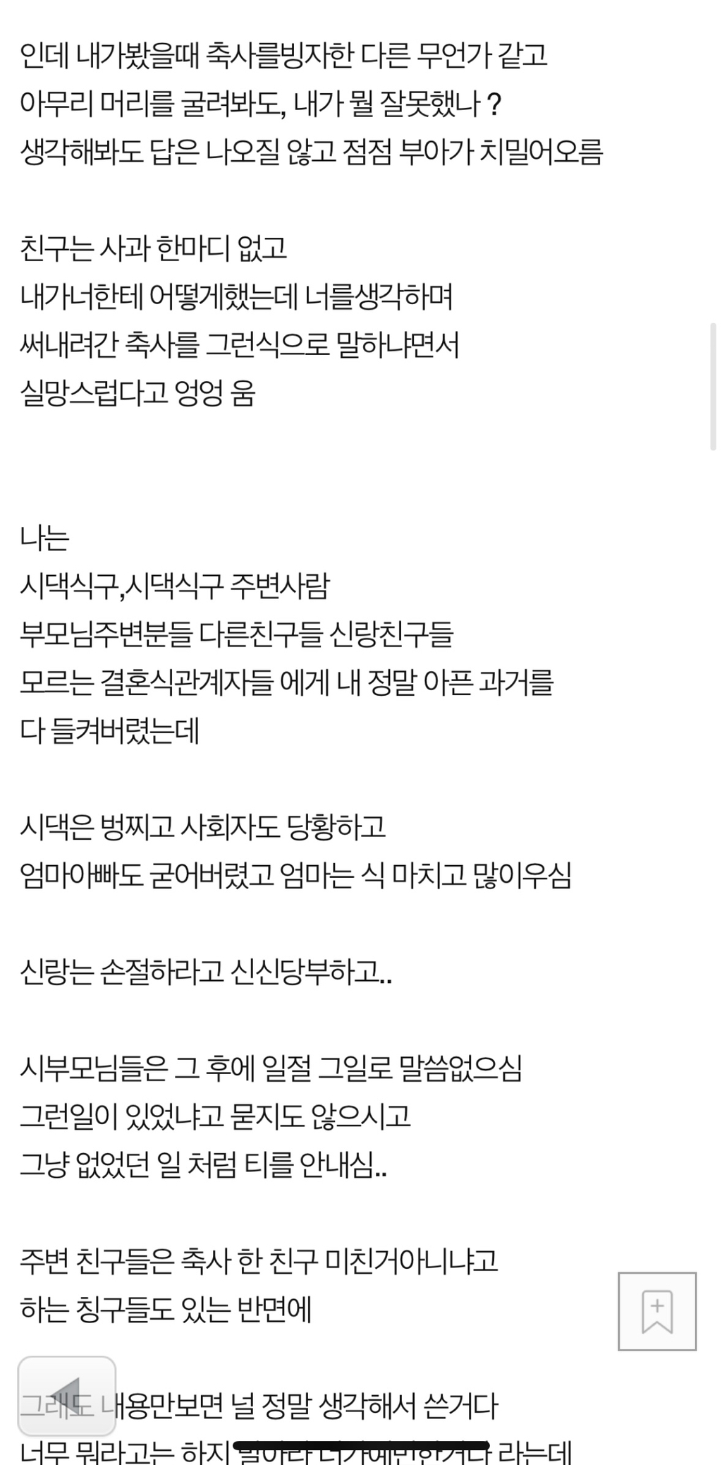 [기타]<네이트판> 제일 친한친구가 결혼식 축사때 우울증과 자해이력을 밝혔어요 작성자SSVvvlllvvllvvvv1|작성시간25.03.22|조회수52,316 목록 댓글 295 글자크기 작게가 글자크기 크게가 출처: https://m.pann.nate.com/talk/374150466?currMenu=talker제일 친한친구가 결혼식 축사때 우울증과 자해이력을 밝혔어요 | 네이트 판결혼/시집/친정 : 제목 그대로 인데 4년전에 우울증을 심하게 앓았고 약복용중에 스스로 손목을 그은적이 있었는데 그때 당시에도 가장 친했던 이 친구가 소식듣고 병원으로 달려와 주었고 그 pann.nate.com 다음검색 현재 게시글 추가 기능 열기 북마크 공유하기 신고 센터로 신고 댓글 댓글 295 댓글쓰기 답글쓰기 댓글 리스트 작성자스우파그여자못잊어모니카 | 작성시간 25.03.23 난 축사에서 신부 전남친 줄줄 읊는것도 봄 ㅋㅋㅋㅋㅋㅋㅋㅋ 작성자뿡빵뿡커리 | 작성시간 25.03.23 친구맞아? 작성자전국길고양이노동조합 | 작성시간 25.03.23 아... ... 작성자익스펠리아무스 | 작성시간 25.03.23 주작. 띄어쓰기 무슨 일이야 작성자내는내다앙앙 | 작성시간 25.03.24 미친거아냐 어떡해 댓글 전체보기