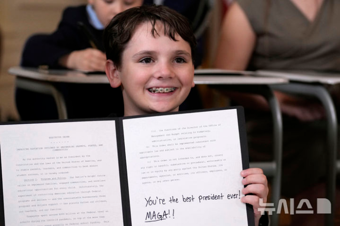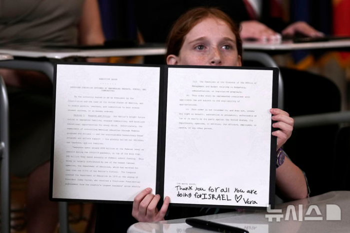 교육부 폐지 행정명령 복제본에 각자 서명하고 이를 펼쳐 보였다.