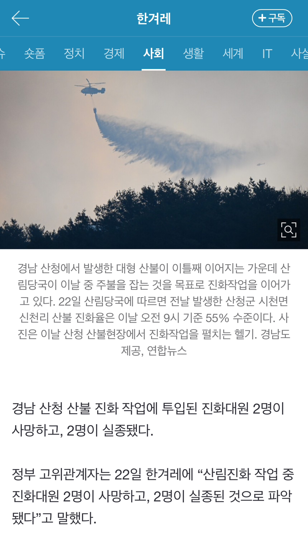 [여시뉴스데스크][속보] 경남 산청 산불 진화대원 2명 사망…2명은 실종 작성자핑팡핑|작성시간25.03.22|조회수70,581 목록 댓글 335 글자크기 작게가 글자크기 크게가 출처: https://n.news.naver.com/article/028/0002736982?sid=102산청 산불 진화대원 2명 사망…2명은 실종경북 산청 산불 진화 작업에 투입된 진화대원 2명이 사망하고, 2명이 실종됐다. 정부 고위관계자는 22일 한겨레에 “산림진화 작업 중 진화대원 2명이 사망하고, 2명이 실종된 것으로 파악됐다”n.news.naver.com 다음검색 현재 게시글 추가 기능 열기 북마크 공유하기 신고 센터로 신고 댓글 댓글 335 댓글쓰기 답글쓰기 댓글 리스트 작성자동구밖과수원길 | 작성시간 25.03.23 삼가 고인의 명복을 빕니다 작성자뽀송핑 | 작성시간 25.03.23 삼가 고인의 명복을 빕니다 작성자감전됐나 | 작성시간 25.03.23 삼가 고인의 명복을 빕니다 작성자Ha Hyun Sang | 작성시간 25.03.23 마음아파 작성자비도오고달도뜨고 | 작성시간 25.03.23 삼가 고인의 명복을 빕니다 댓글 전체보기