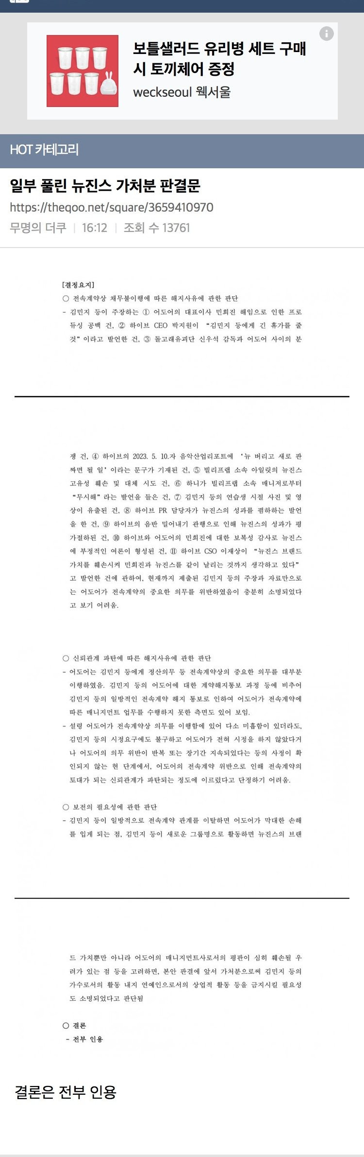 [기타]뉴진스 가처분 판결문 일부 올라옴 작성자댑댑댑|작성시간25.03.22|조회수15,843 목록 댓글 21 글자크기 작게가 글자크기 크게가 출처: 여성시대 댑댑댑 다음검색 현재 게시글 추가 기능 열기 북마크 공유하기 신고 센터로 신고 댓글 댓글 21 댓글쓰기 답글쓰기 댓글 리스트 작성자패션티레모네이드 | 작성시간 25.03.22 NJZ 행복하길 ㅎㅇㅌ 작성자에밀리야 | 작성시간 25.03.22 안쓰러운 뉴진스 꼭 이겨라 작성자귤에 붙어있는 | 작성시간 25.03.23 njz 행복하자ㅠㅜ 작성자스태추 | 작성시간 25.03.23 뉴진스 끝까지 응원해🔥 작성자크리스마스도방콕 | 작성시간 25.03.23 위약금 얼말까..못내나 ㅠ 댓글 전체보기