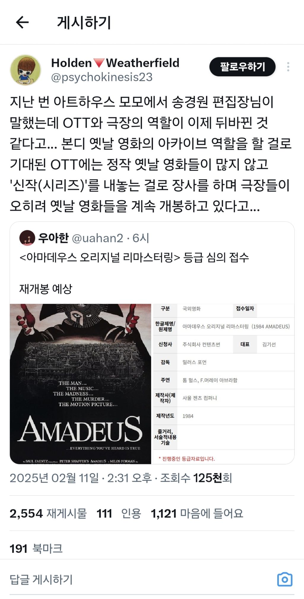 개인적으로 최근의 재개봉 영화로 가득찬 개봉작 리스트가 너무 싫긴 하지만 애초에 극장이 영화를 ’체험‘하는 공간이라는 측면에서는 꽤 제대로 된 역할 분담인 것 같기도 하구요 https://t.co/fEWjFO7jWg