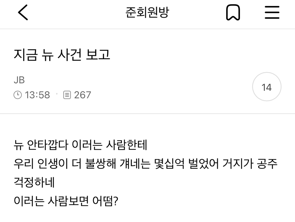 작성자꿈애서받어요 작성시간 25.03.23 아니 바보야? 저런 얘기는 권력자인 상대방이 나에게 피해를 주는 상황임에도 궏력자의 안위를 걱정하는 사람들한테나 하는말이지 뉴진스가 저 상황에서 나한테 뭔 피해를 줬는데 ㅋㅋㅋ 하이브-뉴진스의 상황을 놓고봐야지 나와 뉴진스? 진짜 지능...