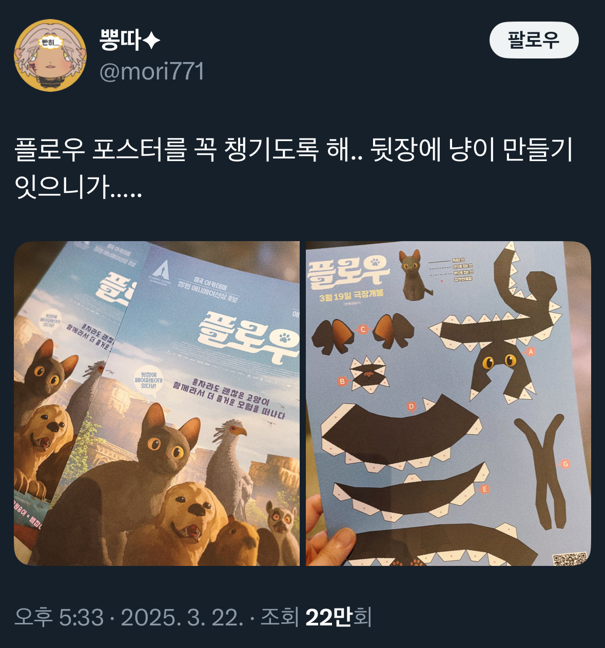 [흥미돋]영화 '플로우‘ 포스터를 꼭 챙겨야 하는 이유 작성자크린투피아|작성시간25.03.23|조회수47,027 목록 댓글 16 글자크기 작게가 글자크기 크게가 출처: 여성시대 (크린투피아)https://x.com/mori771/status/1903364324024078525?s=46&t=6MApZkwkv5g-zNWOerBE1Q고양이 만들기 있음🤭 다음검색 현재 게시글 추가 기능 열기 북마크 공유하기 신고 센터로 신고 댓글 댓글 16 댓글쓰기 답글쓰기 댓글 리스트 답댓글 작성자책읽는고양이 | 작성시간 25.03.23 귀여워ㅠㅜ 답댓글 작성자소금빵순이 | 작성시간 25.03.27 으악 개귀여워 ㅁㅊㅁㅊㅁㅊㅁㅊㅁㅊ 작성자디카페인논알콜 | 작성시간 25.03.23 평 좋아서 너무 보고싶어ㅠ 작성자오가혜 | 작성시간 25.03.23 헐 요새도 저런 포스터를 줘???? 며칠 전에 보고 왔는데 없던데ㅜㅜㅜ 아쉽다ㅜㅜㅜ 작성자sweet potato | 작성시간 25.03.24 ㄱㅇㅇ 댓글 전체보기