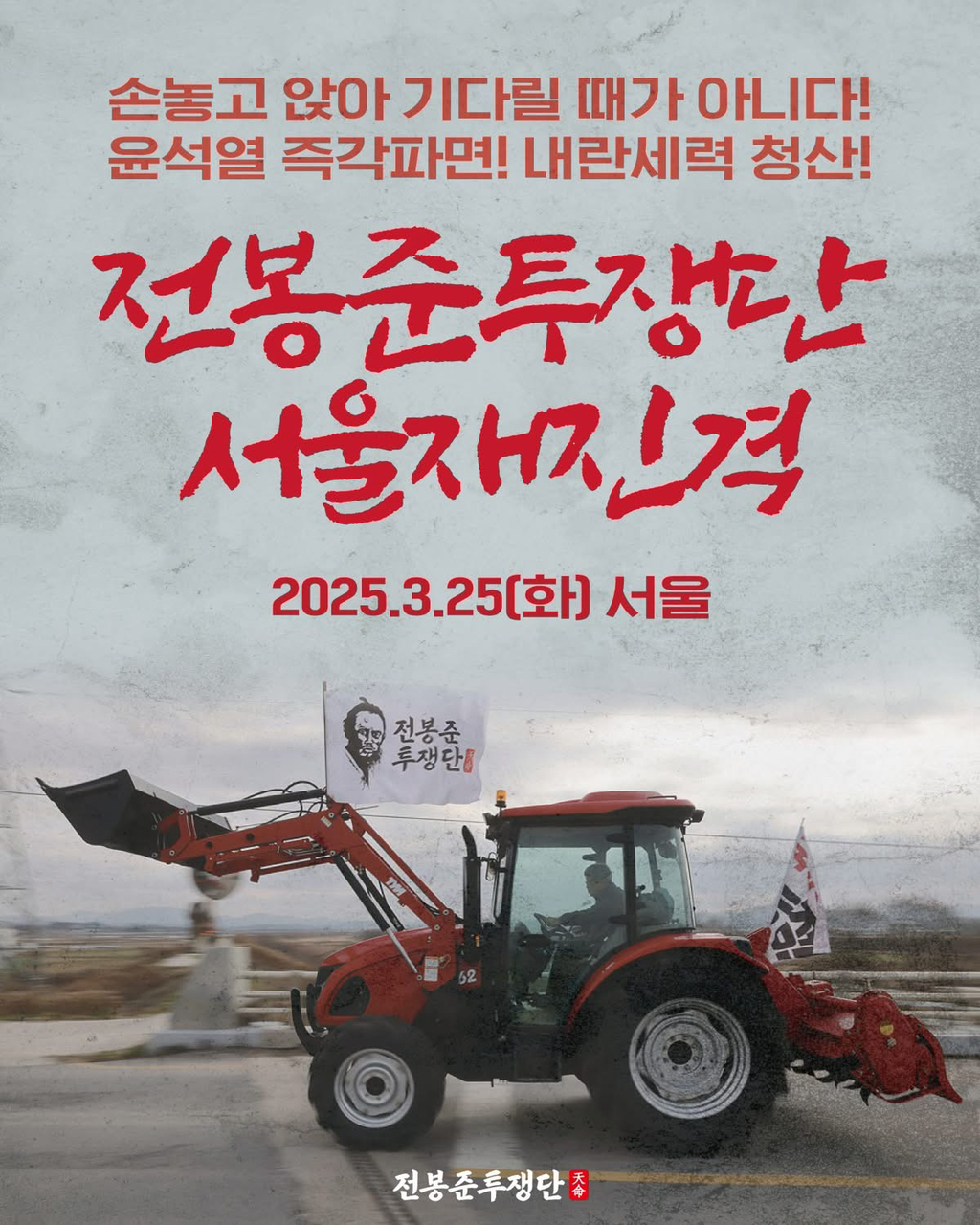 이번주니 다음주니, 인용이니 기각이니, 무의미한 말잔치는 우리의 몫이 아닙니다. 이 답답한 정세를 돌파할 굳센 투쟁, 오직 투쟁만이 우리의 몫이며, 역사와 민중이 내린 천명입니다. 우리의 몫을 다하고 천명을 완수하기 위해, 다시 트랙터에 시동을 걸고 힘차게 서울로 진격합시다!
