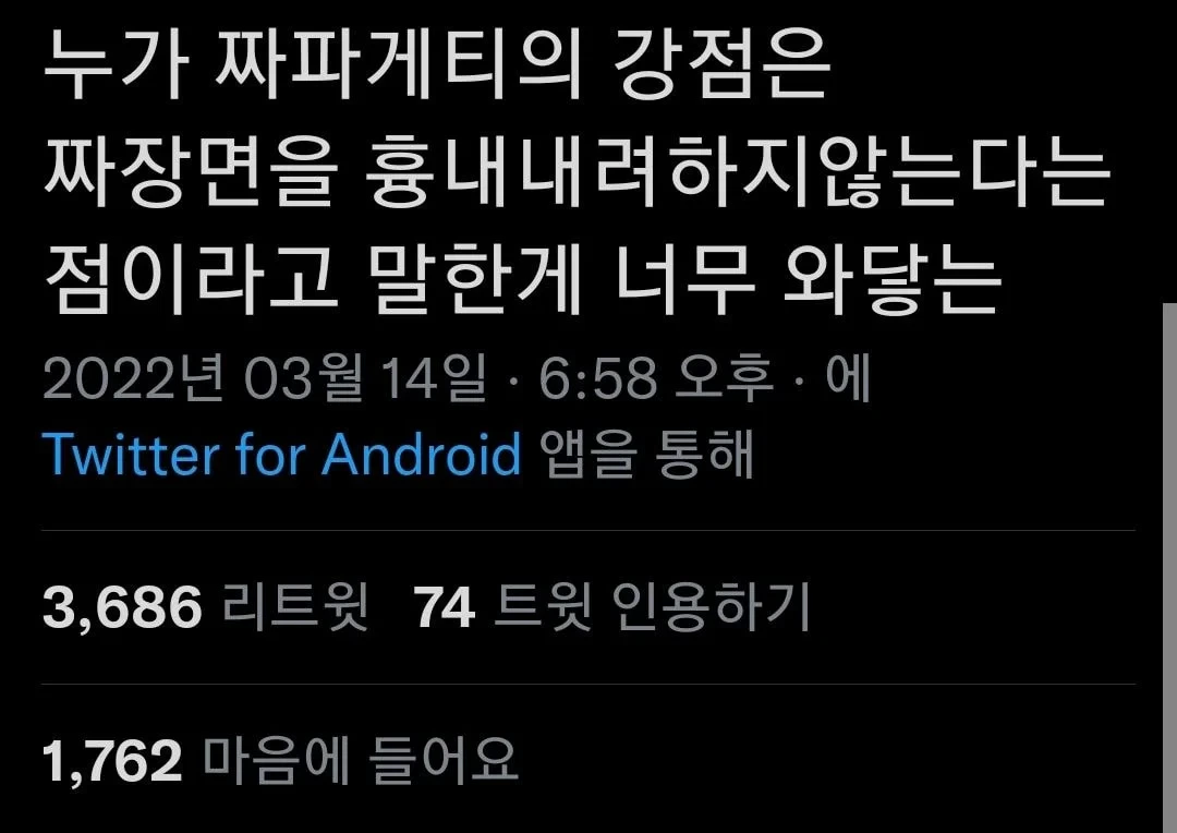 [스크랩] [흥미돋]누가 짜파게티의 강점은...twt 작성자8258|작성시간25.03.23|조회수28,615 목록 댓글 14 글자크기 작게가 글자크기 크게가 출처: https://theqoo.net/square/3648565791ㄹㅇ 짜파게티는 짜파게티 자체로서 경쟁력이 있음 다음검색 스크랩 원문 : *여성시대* 차분한 20대들의 알흠다운 공간 현재 게시글 추가 기능 열기 북마크 공유하기 신고 센터로 신고 댓글 댓글 14 댓글쓰기 답글쓰기 댓글 리스트 작성자망고셔벗 | 작성시간 25.03.23 ㅇㄱㄹㅇㄱㅋㅋㄱㄲㄱㅋ짜파게티가 땡기는 날이 있어 작성자단백질쉐이크 | 작성시간 25.03.23 짜장면 안좋아하는데 짜파게티는 가끔 생각나 완전 다른맛 작성자피자떡복희 | 작성시간 25.03.23 ㅇㅈㅇㅈ 그냥 짜파게티는 짜파게티야짜파게티 먹어야지 작성자사천짜파게티 | 작성시간 25.03.23 사천짜파 최고야 진짜 작성자번역대바보 | 작성시간 25.03.23 맞아 나 짜장면 점심에 먹고 저녁에 짜파게티 땡겨서 먹음 댓글 전체보기