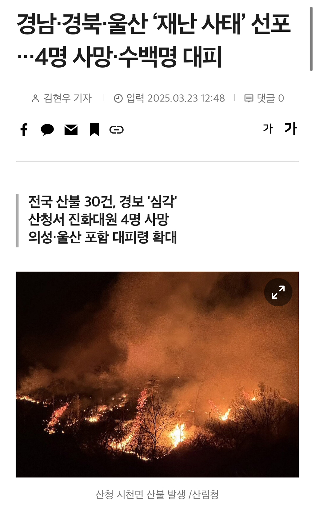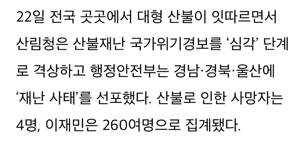 [여시뉴스데스크]경남·경북·울산 ‘재난 사태’ 선포···4명 사망·수백명 대피 작성자슈펄사이|작성시간25.03.23|조회수2,549 목록 댓글 7 글자크기 작게가 글자크기 크게가 출처: https://www.womaneconomy.co.kr/news/articleView.html?idxno=232905#_mobwcvr경남·경북·울산 ‘재난 사태’ 선포···4명 사망·수백명 대피 - 여성경제신문22일 전국 곳곳에서 대형 산불이 잇따르면서 산림청은 산불재난 국가위기경보를 ‘심각’ 단계로 격상하고 행정안전부는 경남·경북·울산에 ‘재난 사태’를 선포했다. 산불로 인한 사망자는 4www.womaneconomy.co.kr전문 출처 다음검색 현재 게시글 추가 기능 열기 북마크 공유하기 신고 센터로 신고 댓글 댓글 7 댓글쓰기 답글쓰기 댓글 리스트 작성자멍멍냥멍냥멍 | 작성시간 25.03.23 비야 언제올래ㅜ 작성자문프잼시민주당빅스안산나레츠고 | 작성시간 25.03.23 우리집 뒷산은 아직도 연기나서 소방차들 오고 구급대원들 계속 오고 공무원분들도 오고 경찰차도 오고ㅠㅠㅠ 난리여ㅠㅠㅠ 작성자닭정강 | 작성시간 25.03.23 이럴때 비가 와여되는데ㅠㅠ 작성자눈송별 | 작성시간 25.03.23 아니 전국적으로 너무 심각하다 작성자러뷰개구리 | 작성시간 25.03.23 아이고 어떡해 댓글 전체보기