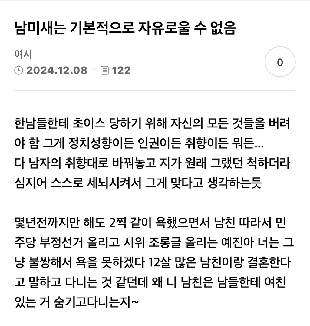 작성자우리함께노래불러요 작성시간 25.03.23 정치고 취향이고 다 떠나서 종속을 원해서 자유를 던짐. 결혼 전엔 친구랑 노는 것도 허락 받아, 엠티 가는 것도 허락받아, 어디 간다고 보고하고, 결혼 후에는 시가 눈치 보면서 애비 밥에 묶여서 친구들이랑 만나다가 호다닥 들어감. 배달이나 외식 이렇게 잘 돼있는 나라에서 지스스로 못챙겨먹는 남편이란 반푼이 위해서 지시간을 다 씀.