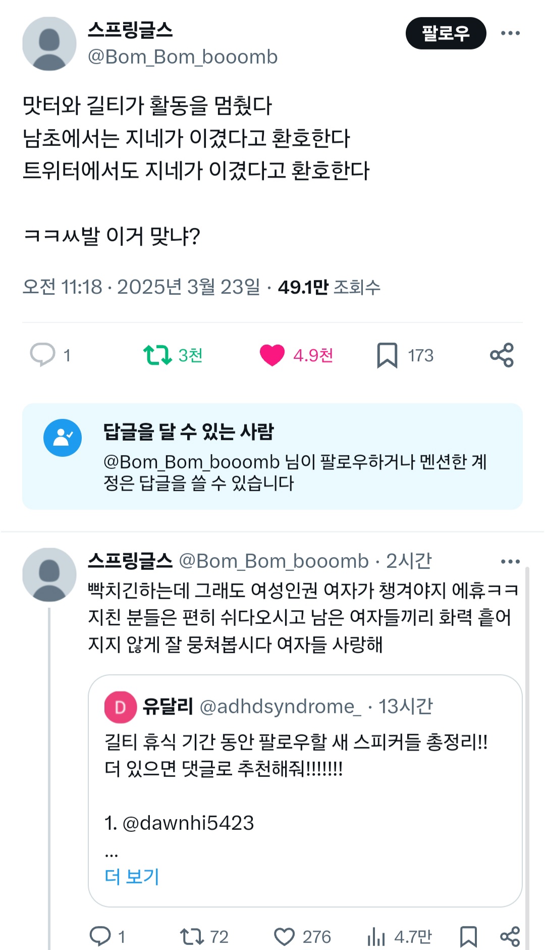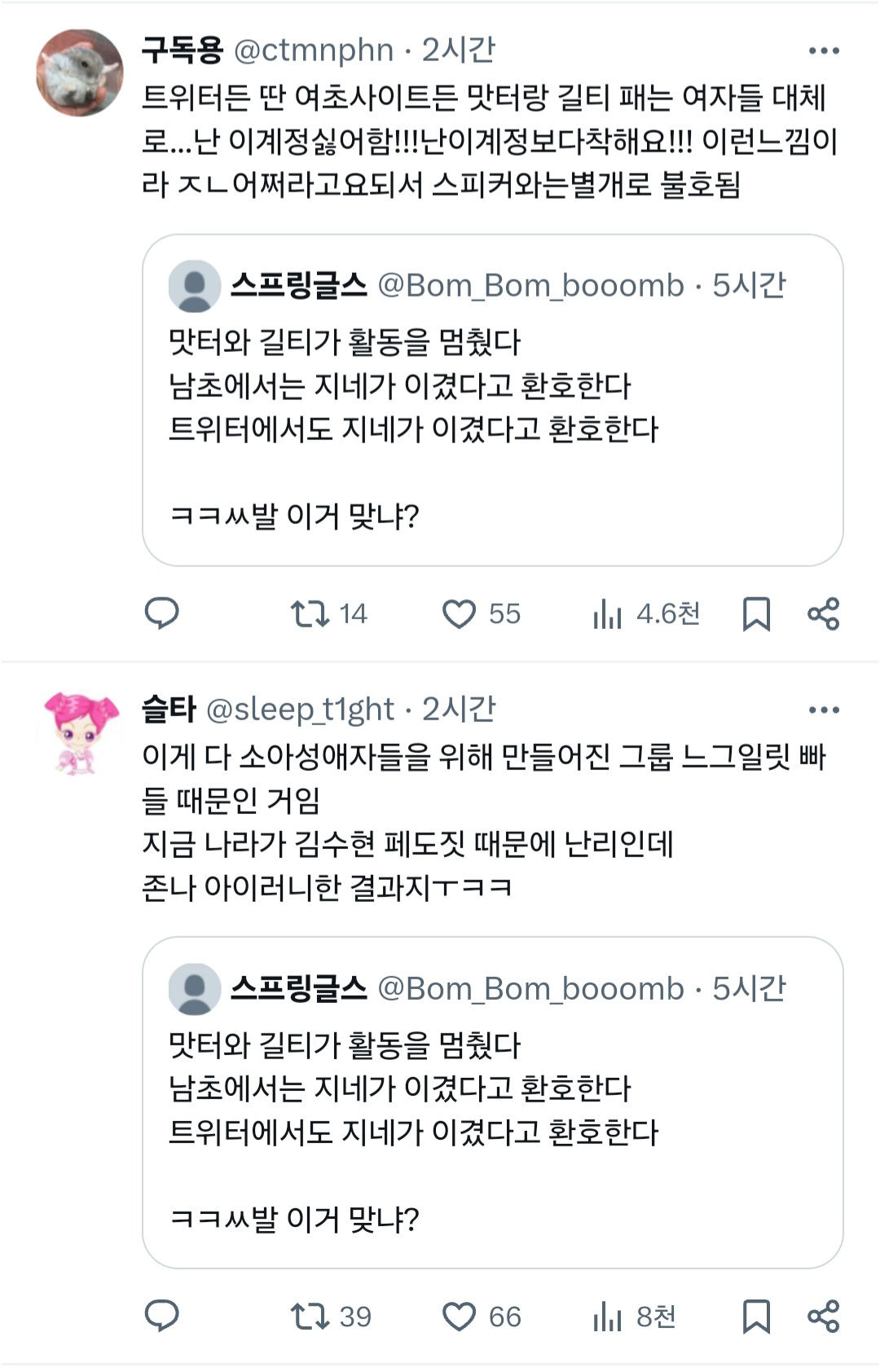 작성자밥병찬 작성시간 25.03.25 ㅋㅋ.. 팀플 진짜 개처망함... 하는건 아무것도 없으면서 머글들이 편까지 들어주길 바라? 사과한거에도 아랑곳 않고 죽어라 싸불한거 누구고 지인들까지 끌어와서 또 싸불시작 개큰 시작 판벌리는거 누구임?