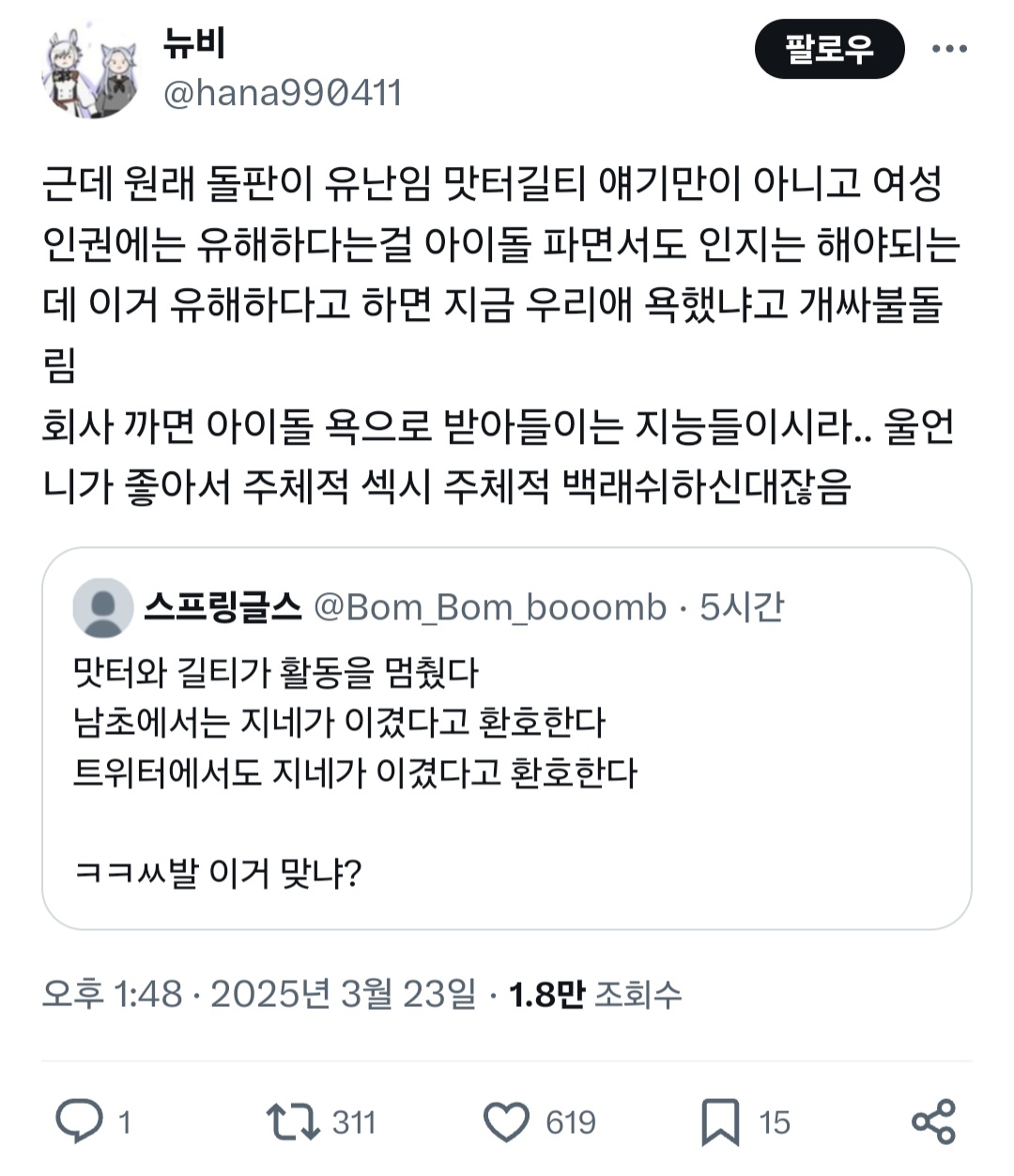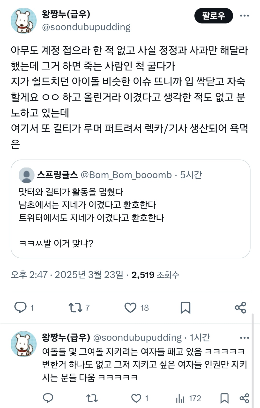 작성자강아지고양이코끼리돌고래들아행복해 작성시간 25.03.25 또또 어떻게든 정당화 할라고 길티는 어쩌고저쩌고 처하네