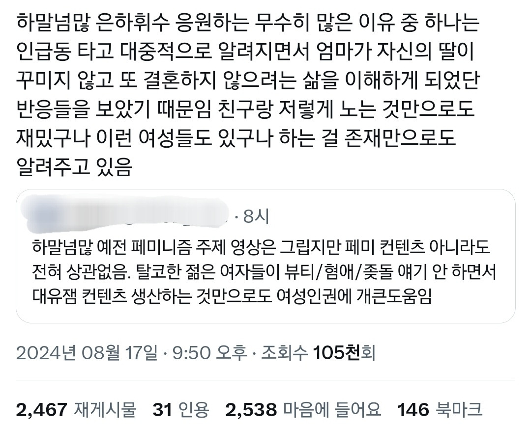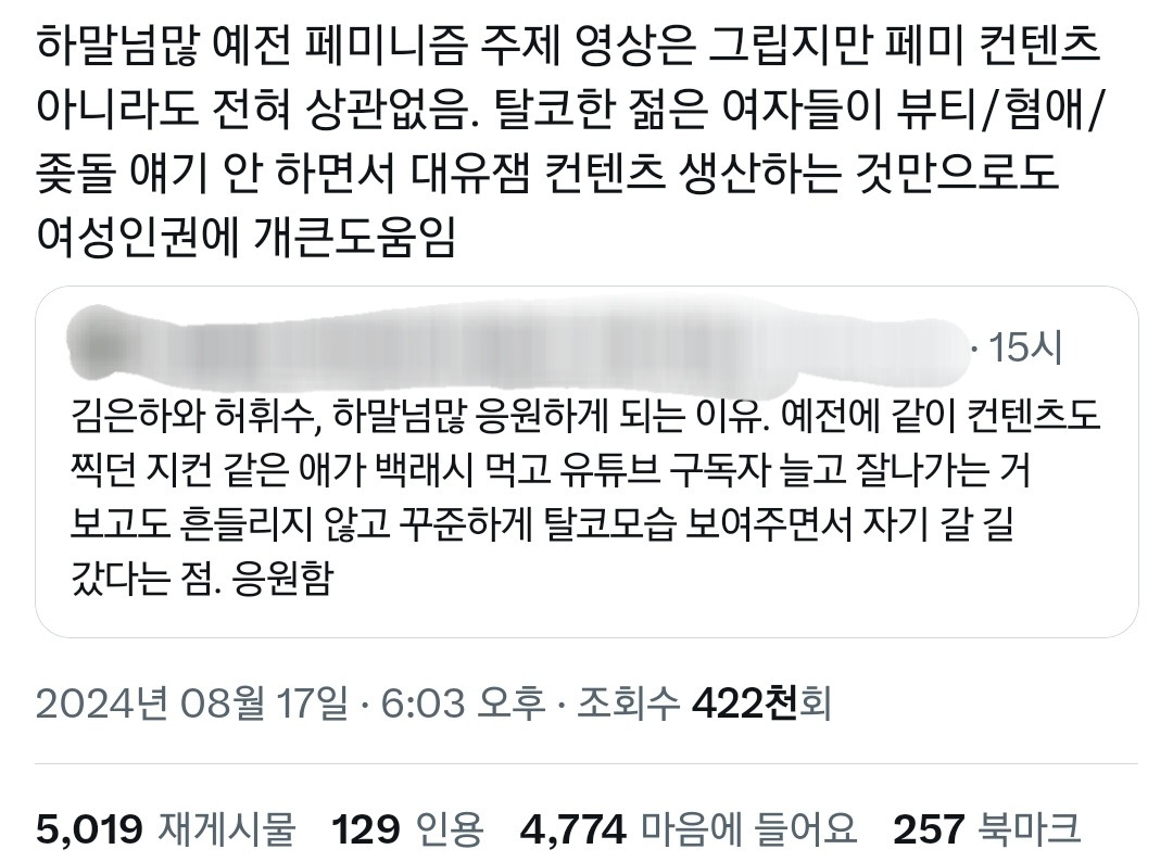 작성자양말지켜 작성시간 25.03.24 하말넘많이나 김은하와허휘수채널은 그냥 존재만으로 페미니즘임