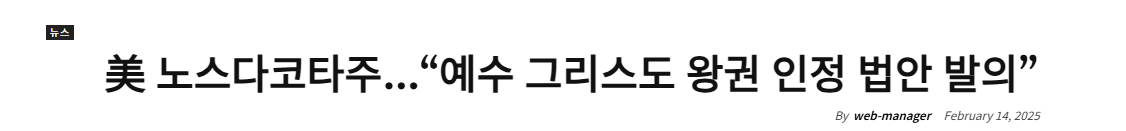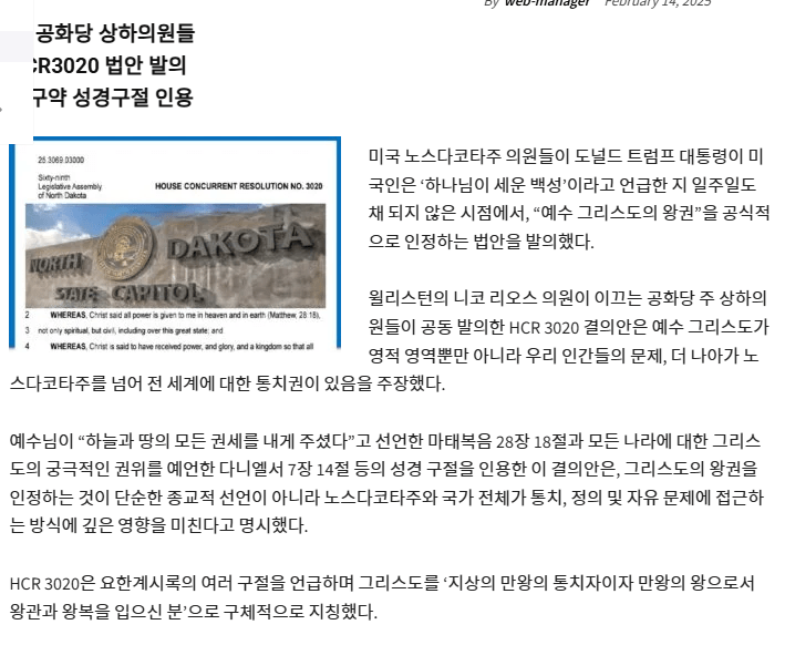 한국 언론에서 다룬 노스다코타주의 "그리스도는 왕이시다" 법안