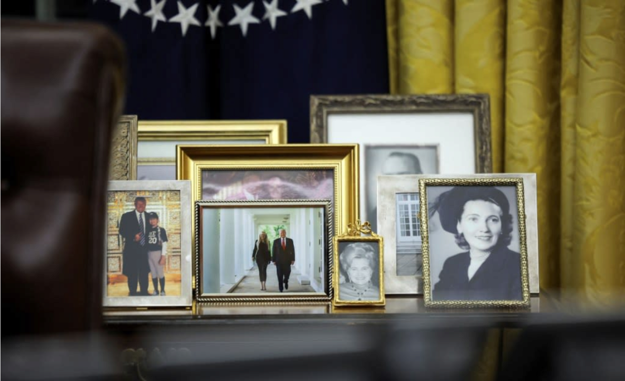 트럼프의 뒷자리에는 부모님 사진, 가족 액자, 기념 코인과 뱃지가 가득하다