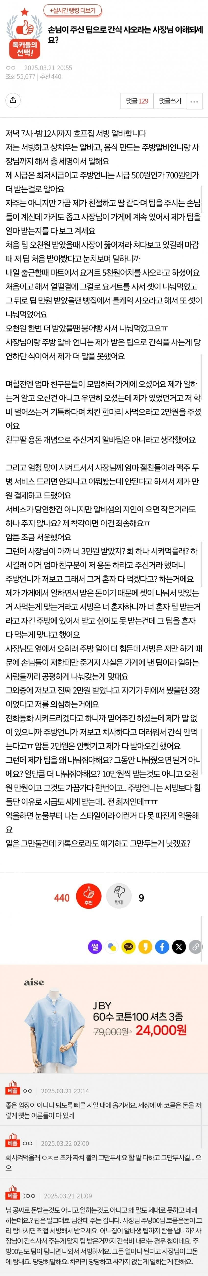 작성자탄핵시키랴회사나가랴집청소하랴 작성시간 25.03.24 서빙만 팁받는게 부러우면 서빙하면 됩니다.. 나도 주방일 하는데 서빙하면서 친절하고 잘 챙겨줄때나 팁받는거지 사람들이 미국처럼 다주고 가는것도 아닌데