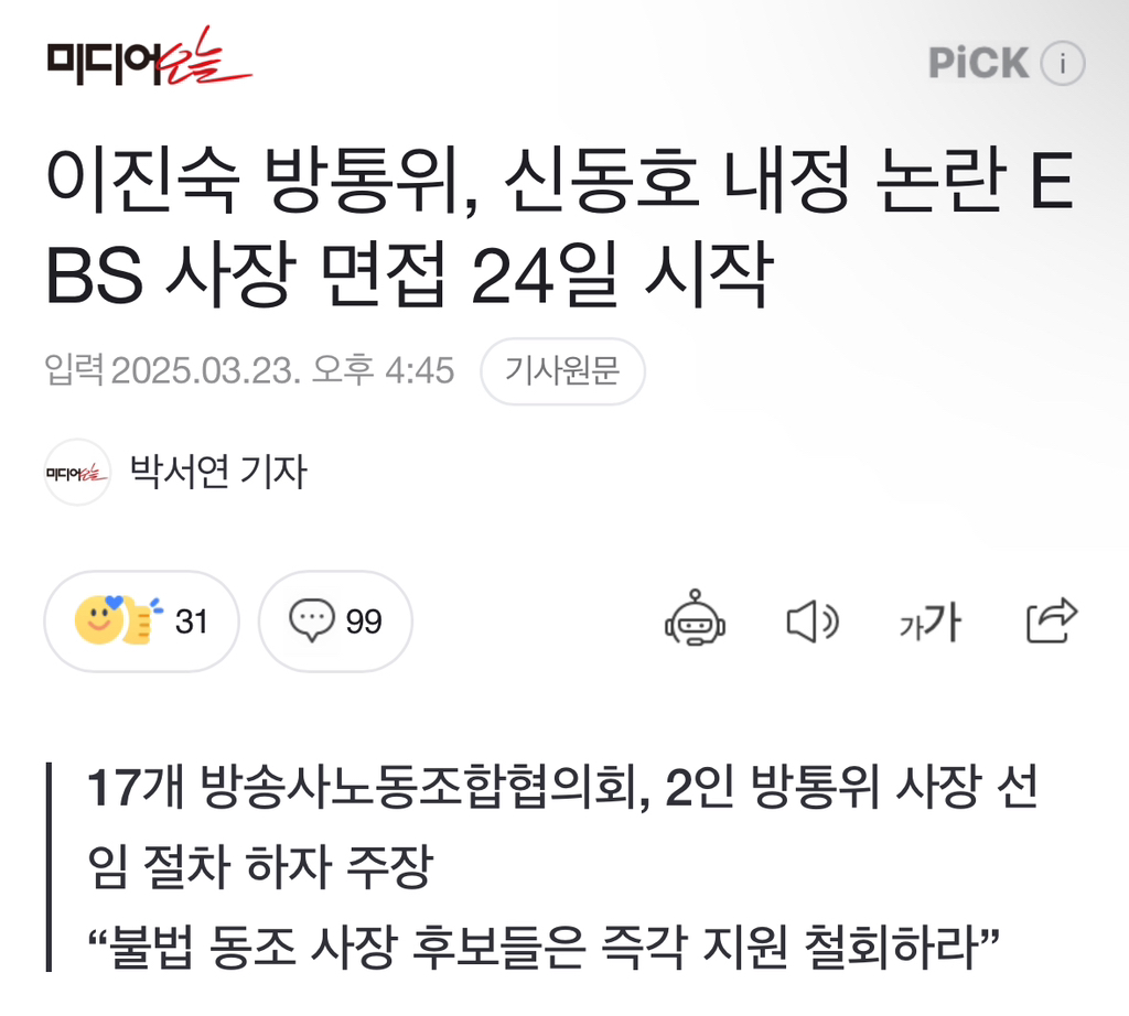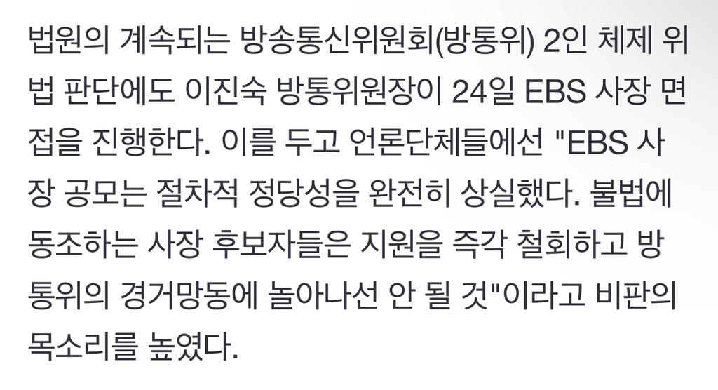 [여시뉴스데스크]이진숙 방통위, 신동호 내정 논란 EBS 사장 면접 24일 시작 작성자소리앙|작성시간25.03.24|조회수932 목록 댓글 8 글자크기 작게가 글자크기 크게가 출처: https://naver.me/GOPkyGPs이진숙 방통위, 신동호 내정 논란 EBS 사장 면접 24일 시작법원의 계속되는 방송통신위원회(방통위) 2인 체제 위법 판단에도 이진숙 방통위원장이 24일 EBS 사장 면접을 진행한다. 이를 두고 언론단체들에선 "EBS 사장 공모는 절차적 정당성을 완전히 상실n.news.naver.com전문출처 다음검색 현재 게시글 추가 기능 열기 북마크 공유하기 신고 센터로 신고 댓글 댓글 8 댓글쓰기 답글쓰기 댓글 리스트 작성자죠캅죠 | 작성시간 25.03.24 시핥. 진짜 개판이네 작성자내려와새꺄 | 작성시간 25.03.24 ㅅㅂ 가지가지 작성자Jackfruit | 작성시간 25.03.24 아 빡쳐-- 작성자바쩡아의나라 | 작성시간 25.03.24 아 ㅅㅂ 작성자사랑아망곰해 | 작성시간 25.03.24 하...진짜 댓글 전체보기