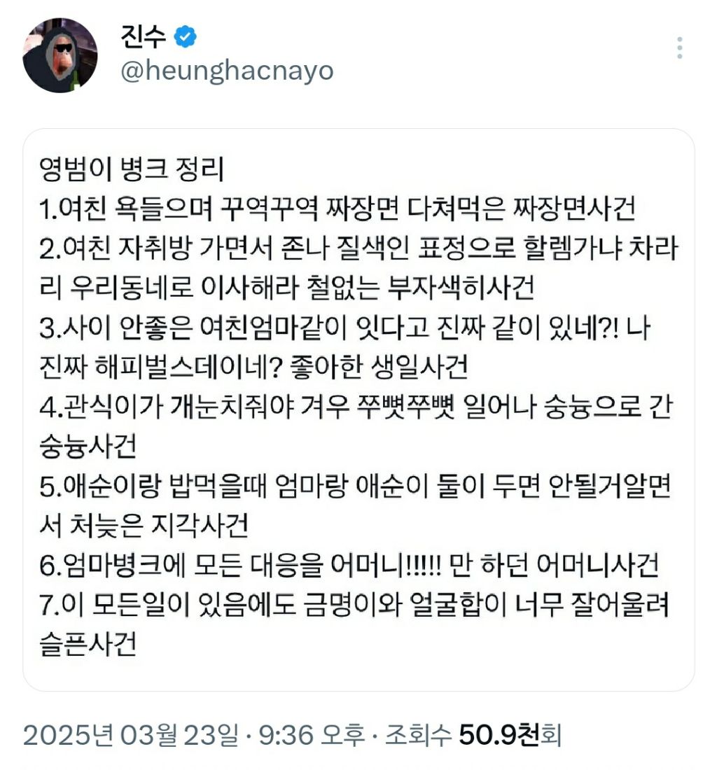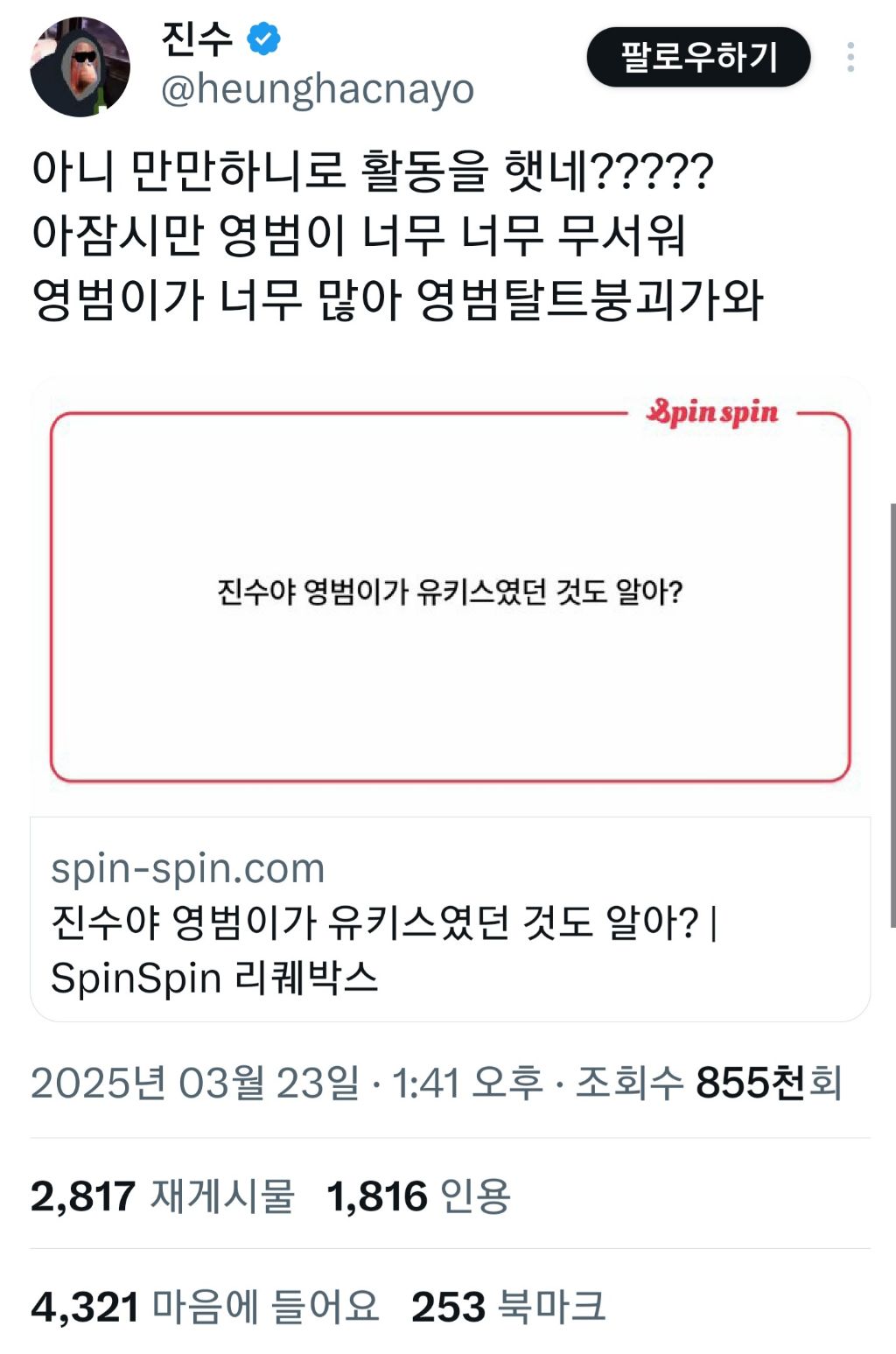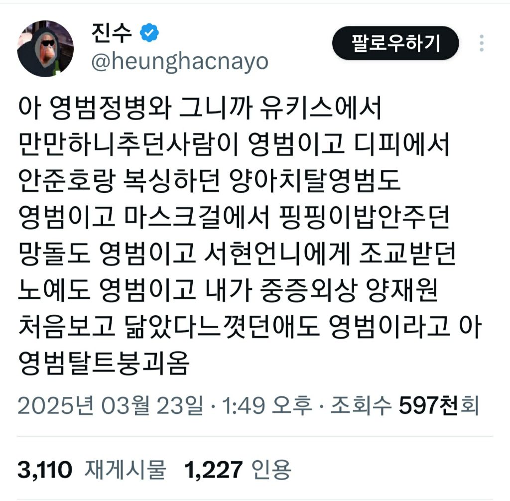 [흥미돋]폭싹속았수다 영범이 찰지게 패는 진수 작성자그레인베이글|작성시간25.03.24|조회수17,293 목록 댓글 50 글자크기 작게가 글자크기 크게가 출처: https://x.com/heunghacnayo/status/1903787877592621142?t=QNQVjI1Ok-C4NJ-e64swNA&s=19우선 아이돌이였던 본체에 놀란 진수 다음검색 현재 게시글 추가 기능 열기 북마크 공유하기 신고 센터로 신고 댓글 댓글 50 댓글쓰기 답글쓰기 댓글 리스트 작성자인생사혼자사는거지 | 작성시간 25.03.24 어머니!!!!ㅋㅋㅋㅋㅋㅋㅋㅋㅋㅋㅋㅋ 와 진짜 찰지게 때린다..^^ 작성자지만편한세상 | 작성시간 25.03.24 영범이 ㄹㅇ개많이 나옴 멜로무비에도 나와 작성자감쟈깜쟈 | 작성시간 25.03.24 헐 영범이 유키스였다니!!! 작성자해발고도 | 작성시간 25.03.24 영범이 유키사였다고???? 작성자know waves | 작성시간 25.03.26 아 애웃기네 진짜 댓글 전체보기