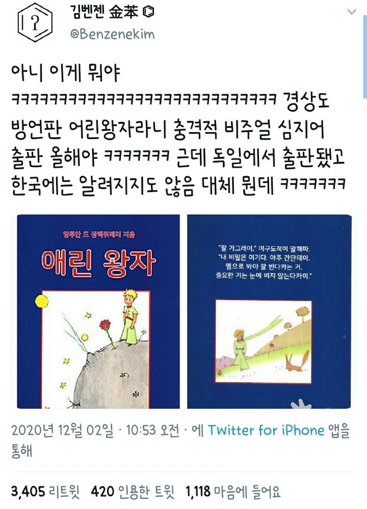 [스크랩] [흥미돋]내는 이래가 애린 왕자를 알았따. 작성자natural|작성시간25.03.24|조회수16,136 목록 댓글 17 글자크기 작게가 글자크기 크게가 출처: 여성시대 초록매실 드세요.원글 삭제로 긁어왔어낭독은 6분부터트위터에서 알티 돌았던 경상도버전 어린왕자인 애린왕자ㅋㅋㅋㅋ를 낭독했길래 같이보고싶어서 가져왔음ㅋㅋㅋㅋㅋ대략 이런책임ㅋㅋㅋㅋㅋ전세계의 언어 및 사투리로 어린왕자를 아카이빙 하고자 한 독일 출판사의 프로젝트의 일환으로 나온 책이래 (모스부호로도 출판됨)글로 읽는거보다 듣는게 존나 찐이기 때문에 다들 일단 들어봤음 좋겠음ㅋㅋㅋㅋㅋㅋ6분부터 다음검색 스크랩 원문 : *여성시대* 차분한 20대들의 알흠다운 공간 현재 게시글 추가 기능 열기 북마크 공유하기 신고 센터로 신고 댓글 댓글 17 댓글쓰기 답글쓰기 댓글 리스트 작성자허니카모마일 | 작성시간 25.03.24 ㅌㅌㅌㅌㅌㅌㅌㅌ 작성자선인장인선 | 작성시간 25.03.24 어 저 남자분 연극에서 봤는데 작성자비밀의늪 | 작성시간 25.03.24 김윈터 개큰웃음ㅋㅋㅋㅋㅋㅋㅋ 작성자코스타리카시다모 | 작성시간 25.03.24 시번째가 넘 웃김ㅌㅋㅋㅋㅋㅋ 작성자케로베로니케로베로니 | 작성시간 25.03.24 ㄷㄷ 얼라 왕자헴 댓글 전체보기