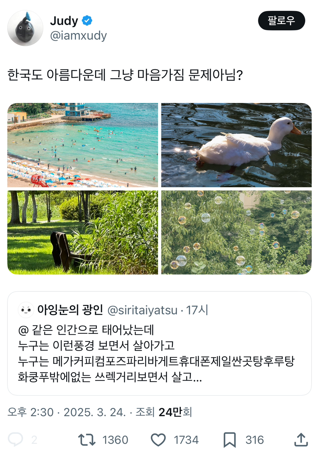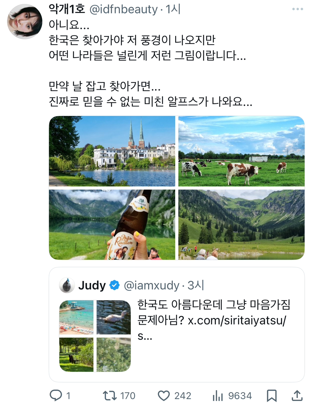 작성자죠르디만세 작성시간 25.03.31 ㄹㅇ뭔 한국이 아름다워 ㅋㅋㅋ 해외도시도 예쁜곳 얼마나 많은데 한국은 아파트숲에서 바로 팍식고 일단 날씨부터 구려서 마이너스보정됨 구린걸 구리다고하지 뭐가 폄하라는거