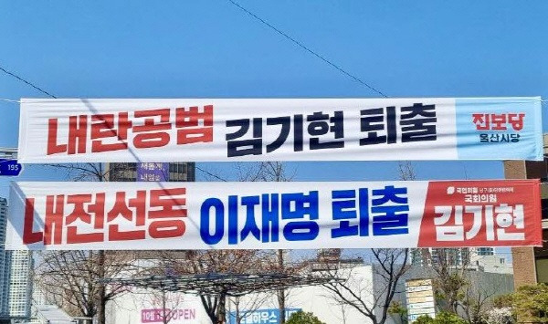 울산시의 현수막 설전이 뜨겁다. 울산 남구을 지역구 국회의원인 김기현 국민의힘 의원이 "내란선동 이재명 퇴출" 현수막을 걸었는데, 곧이어 "내란공범 김기현 퇴출"이란 반박 현수막이 걸렸다. 현수막은 더불어민주당이 아닌 진보당 울산시당이 걸었다.