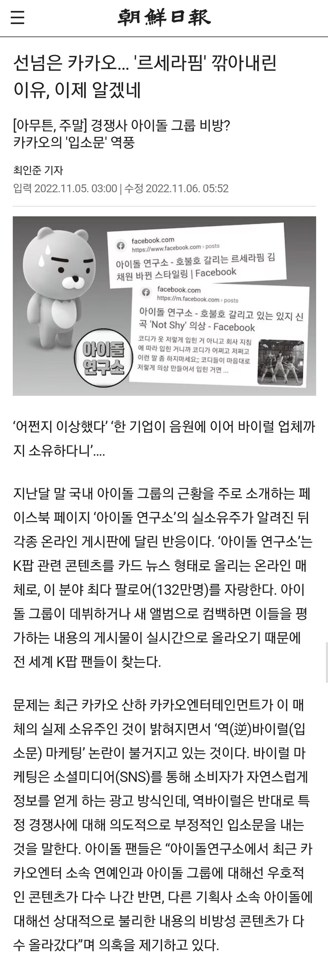 2022년 11월 5일 조선일보발 카카오 역바이럴 기사