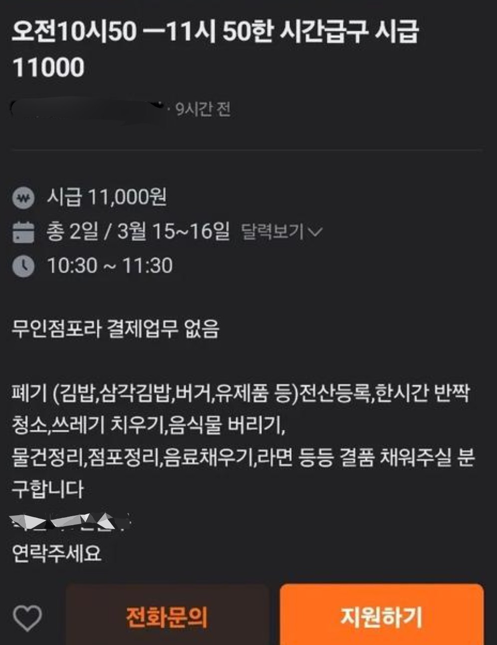 [기타]한시간 짜리 편의점 알바 작성자엽동이.|작성시간25.03.25|조회수21,439 목록 댓글 43 글자크기 작게가 글자크기 크게가 출처: 여성시대 엽동이. 다음검색 현재 게시글 추가 기능 열기 북마크 공유하기 신고 센터로 신고 댓글 댓글 43 댓글쓰기 답글쓰기 댓글 리스트 작성자탄핵하바하 | 작성시간 25.03.25 나 2평짜리 미니 파티룸 했는데5분이면 청소 끝나는데도 1만원 줬다 ㅡㅡ; 작성자푸방옹 | 작성시간 25.03.25 미친인간아 좀 작성자송이양 | 작성시간 25.03.25 한시간동안 자리만 지켜라고해도 누가갈까말까구만 알차게 청소며 뭐며 존나 다시키네ㅅㅂㅋㅋㅋㅋㅋㅋㅋ 작성자석열이언제가누 | 작성시간 25.03.25 니가해 ㅋ 작성자오빤키도작으면서 | 작성시간 25.03.26 야이씨 일당도아니고.. 댓글 전체보기