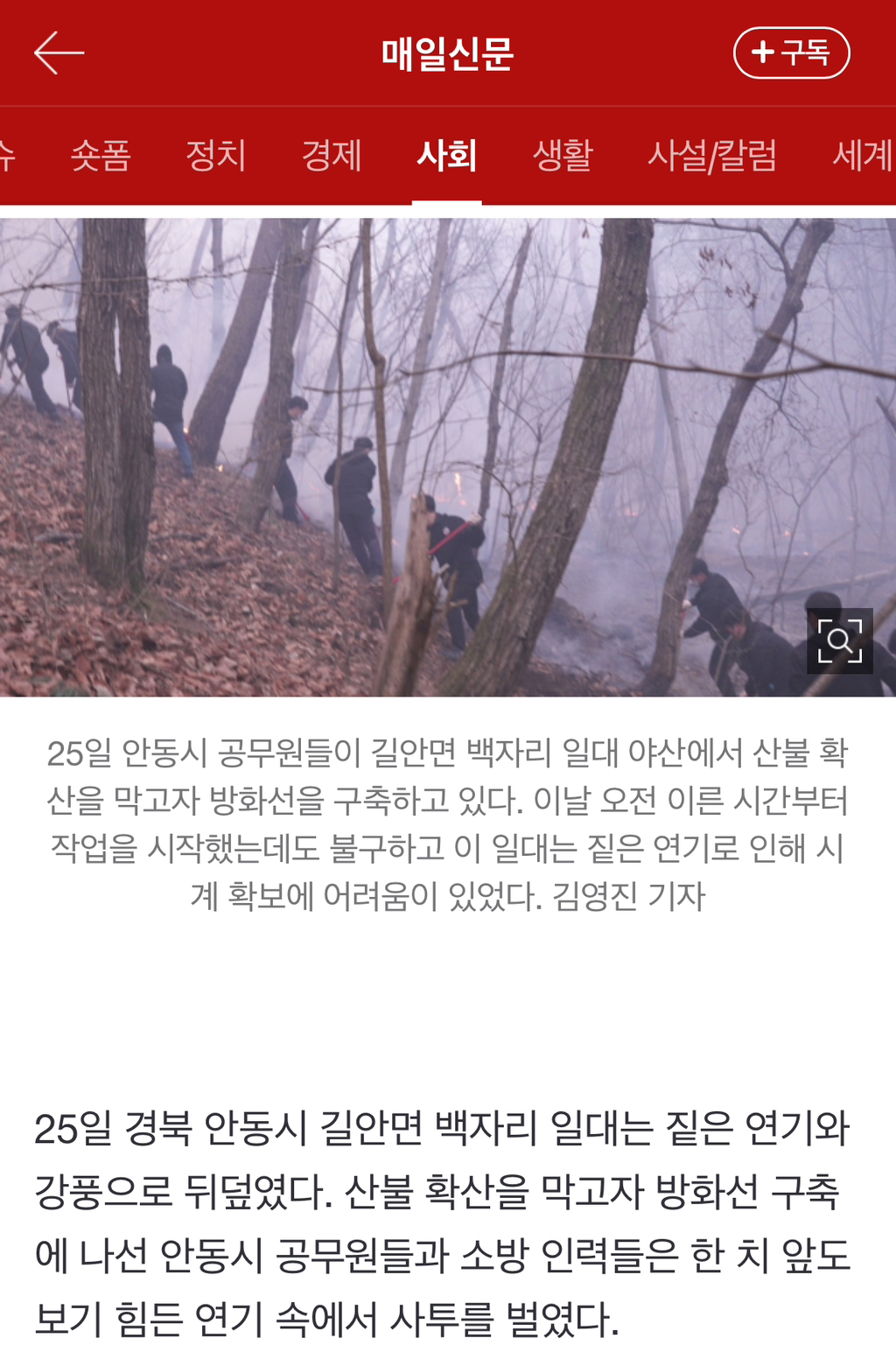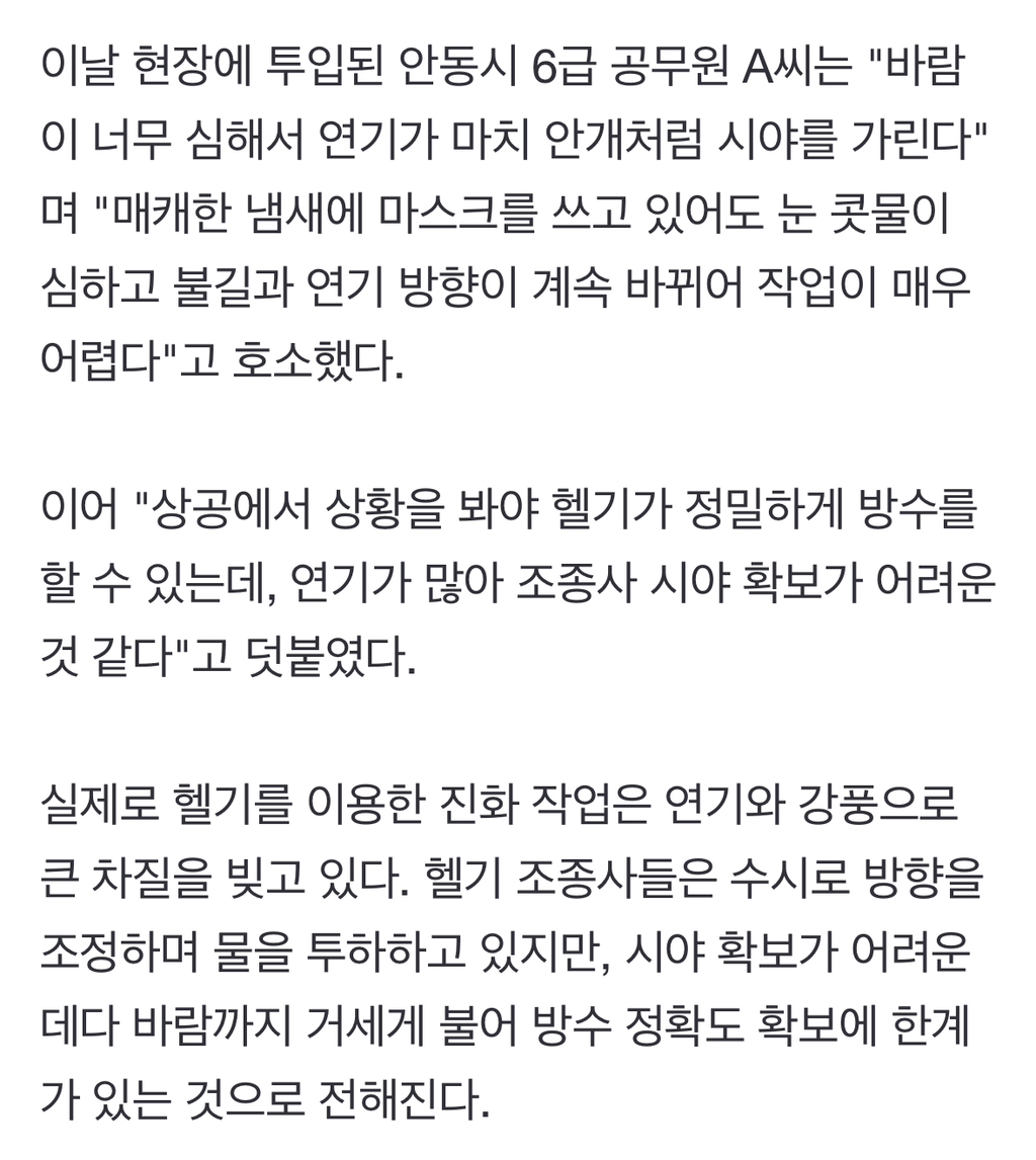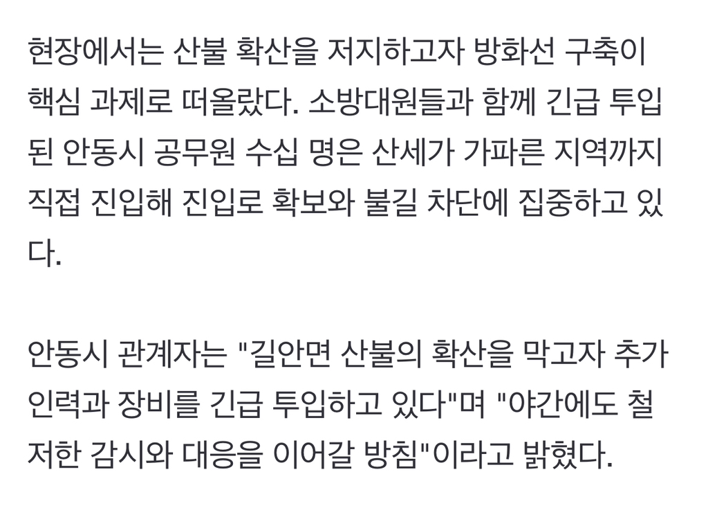 [여시뉴스데스크]"연기 때문에 앞이 안 보여"… 안동시청 공무원들, 강풍 속 방화선 구축 진땀 작성자큐브브|작성시간25.03.25|조회수1,934 목록 댓글 3 글자크기 작게가 글자크기 크게가 출처: https://n.news.naver.com/article/088/0000937934?sid=102"연기 때문에 앞이 안 보여"… 안동시청 공무원들, 강풍 속 방화선 구축 진땀25일 경북 안동시 길안면 백자리 일대는 짙은 연기와 강풍으로 뒤덮였다. 산불 확산을 막고자 방화선 구축에 나선 안동시 공무원들과 소방 인력들은 한 치 앞도 보기 힘든 연기 속에서 사투를 벌n.news.naver.com 다음검색 현재 게시글 추가 기능 열기 북마크 공유하기 신고 센터로 신고 댓글 댓글 3 댓글쓰기 답글쓰기 댓글 리스트 작성자랴!!!! | 작성시간 25.03.25 진짜 안동 지금 바람 엄청 심한데 ㅠㅠ 비라도 오면 좋겠다 작성자Bluuue | 작성시간 25.03.25 ㅠㅠㅠ 작성자내딸김사월 | 작성시간 25.03.25 비야 목욜 말고 바로 오면 안돼나 진나ㅠㅠㅠ 댓글 전체보기