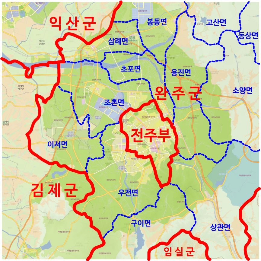 기존의 전주군으로 묶였던 지역은 완주군으로 이름이 바뀐다
