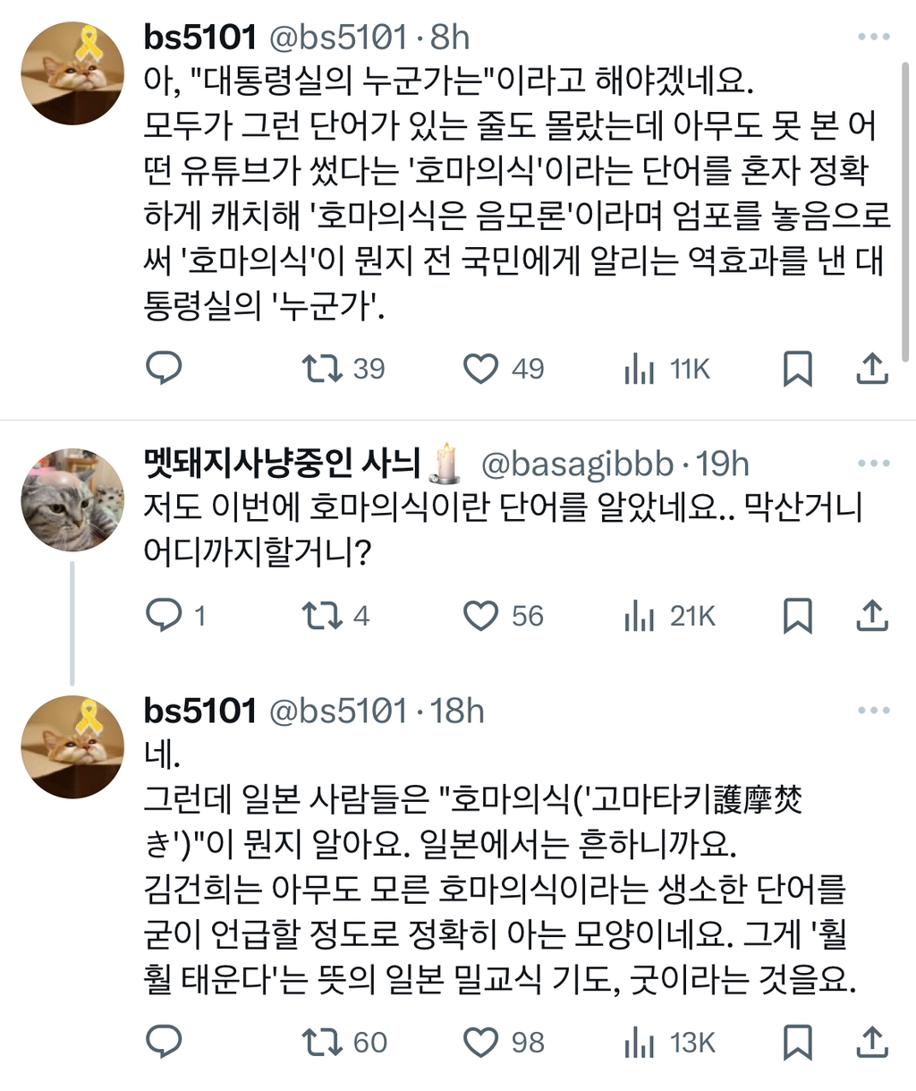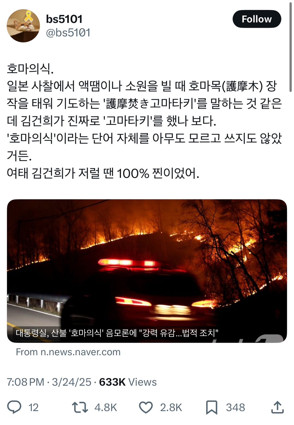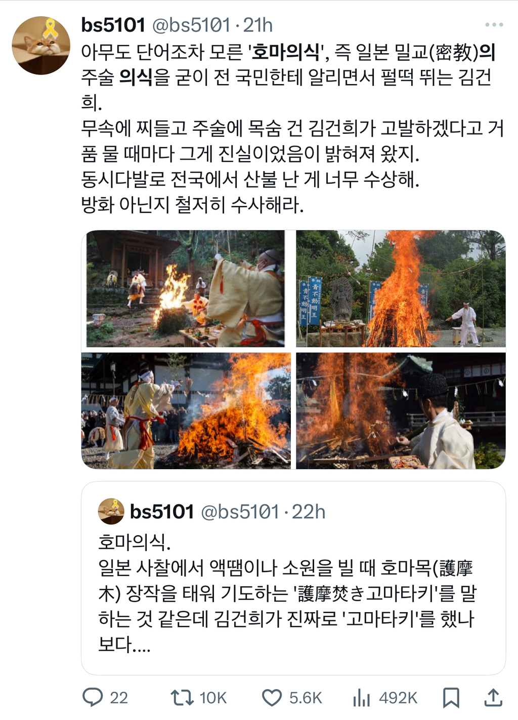 [흥미돋][트위터캡쳐] 일본 사람들은 호마의식(고마타키)이 뭔지 알아요. 일본에서는 흔하니까요. 작성자보면몰라?먹었으니살쪘지|작성시간25.03.25|조회수12,293 목록 댓글 60 글자크기 작게가 글자크기 크게가 출처: https://x.com/bs5101/status/1904112972777312729X의 bs5101님(@bs5101)호마의식. 일본 사찰에서 액땜이나 소원을 빌 때 호마목(護摩木) 장작을 태워 기도하는 '護摩焚き고마타키'를 말하는 것 같은데 김건희가 진짜로 '고마타키'를 했나 보다. '호마의식'이라는 단어x.com+ 위키 호마의식 뜻 ++후지산 개산식 때도 호마의식 했다고;; https://m.blog.naver.com/PostView.naver?blogId=goshizuoka&logNo=222806346922&proxyReferer=https:%2F%2Fwww.google.com%2F&trackingCode=external 다음검색 현재 게시글 추가 기능 열기 북마크 공유하기 신고 센터로 신고 댓글 댓글 60 댓글쓰기 답글쓰기 댓글 리스트 작성자맹고스므듸 | 작성시간 25.03.25 아 죽어라 진짜 죽어 작성자Giii | 작성시간 25.03.25 아제발 누가 죽여주세요 제발ㅜㅜ 작성자비틀즈 | 작성시간 25.03.25 얼마나 좆본 문화를 더 알려주려고 이러는거임? 작성자올조이 | 작성시간 25.03.30 ......... 작성자Hell Angel | 작성시간 25.04.05 ㅁㅊ 댓글 전체보기
